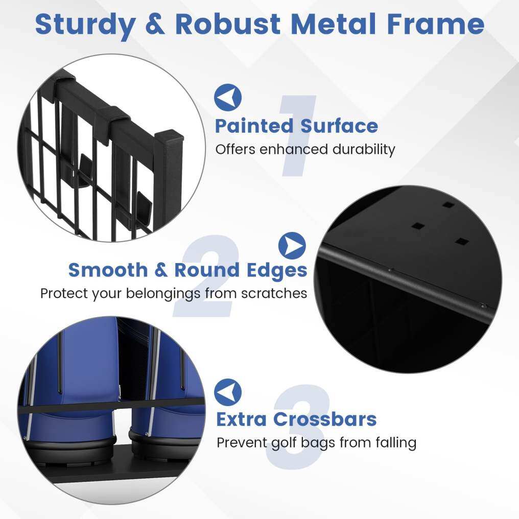Sturdy and Robust Metal Frame: Crafted with a painted surface, this golf storage organizer is designed to withstand the wear of your golfing equipment. The smooth and round edges protect your belongings from scratches. Plus, the extra crossbars prevent golf bags from falling.