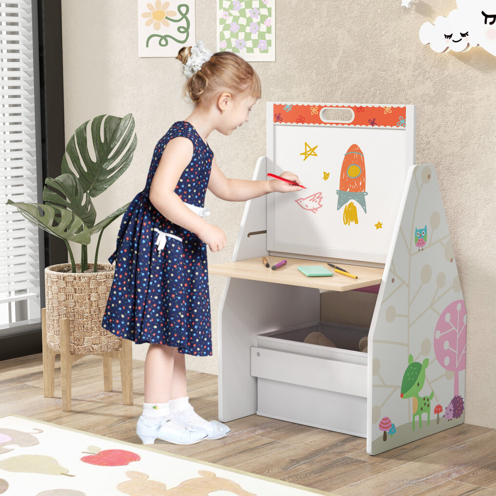 ● Double-sided Art Easel: This kids' art easel is built with a double-sided design, featuring both a magnetic chalkboard and a magnetic whiteboard. It will let your child's creativity and imagination run wild as they create beautiful works of art and explore different drawing and writing mediums.