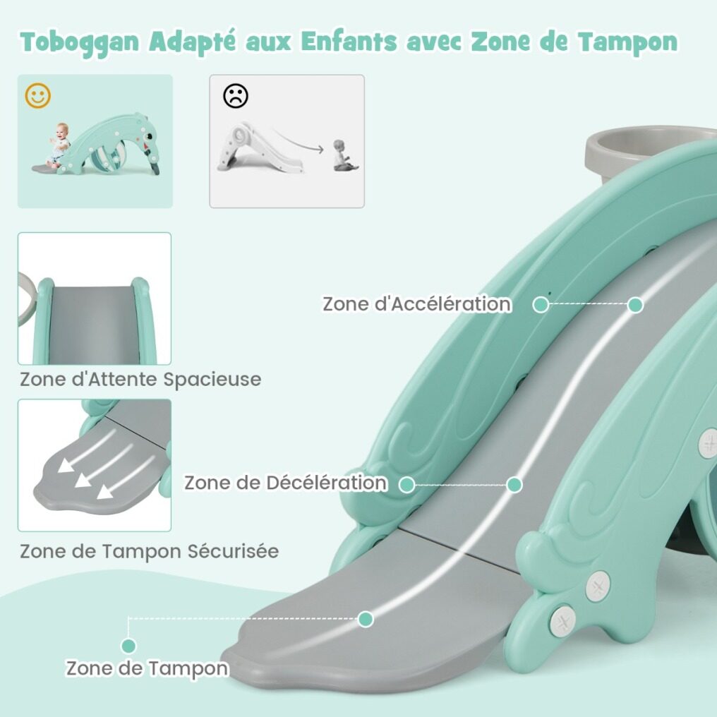 ● Kid-friendly Slide with Buffer: The slideway includes the acceleration zone, deceleration zone, and considerate buffer zone, allowing kids to slide down smoothly and safely. The spacious waiting area enables kids to sit comfortably, while the 2-step climbing ladder ensures easy climbing.