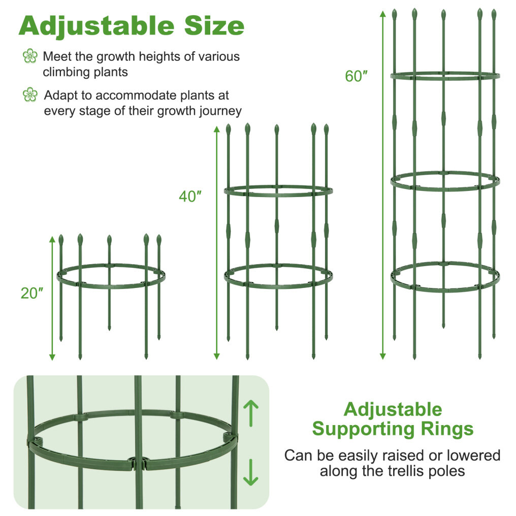 ● Adjustable Size: The 40"/60" tall plant support trellis comes with 2/3 height options-20"/40", 20"/40"/60", which meet the growth heights of various climbing plants, and adapt to accommodate plants at every stage of their growth journey. Additionally, the trellises can also be combined to create even taller sizes. And the supporting rings can be easily raised or lowered along the trellis poles.