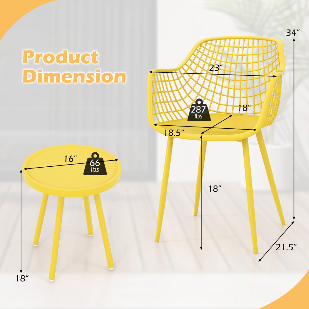 ● Awesome Relaxing Choice: This 3-piece furniture set is a wonderful addition to any space in need of a relaxing touch, including your porch, backyard, or living room. Dimension of each chair: 21.5"x 23" x 34" (L x W x H). Dimension of coffee table: 16" x 18" (Dia x H).