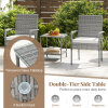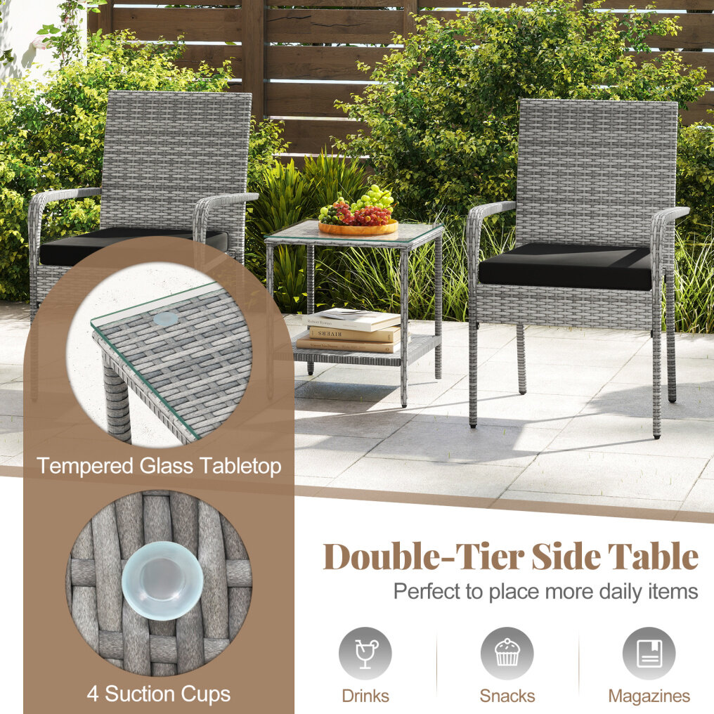 ● Double-Tier Side Table: This patio rattan set features a 2-tier side table, offering more space for drinks, snacks and magazines. The tabletop made of tempered glass is both stylish and easy to clean, securely held in place by 4 suction cups.