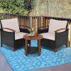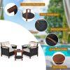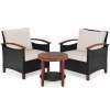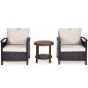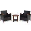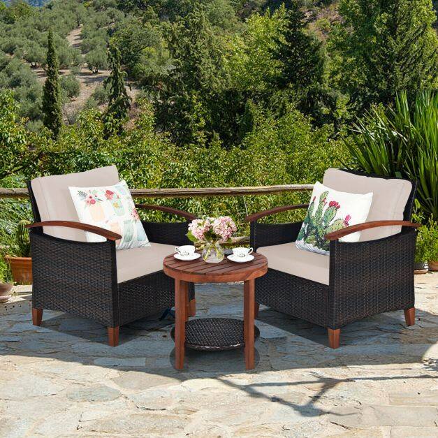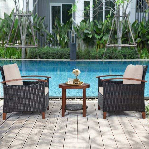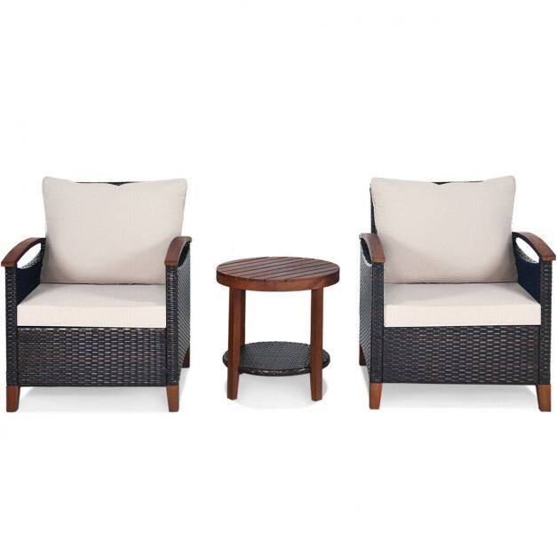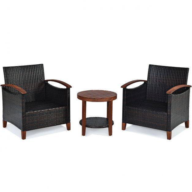 Are you looking for a comfortable chair set to relax in during your leisure time? This 3 piece rattan chair set is your ideal choice. With a wooden tabletop, which is easy to clean and a bottom shelf providing additional space to hold your items, the classic, natural appearance makes this furniture set suitable for your patio, garden and backyard. If you are looking for a rattan chair set like this, do not hesitate to place an order!