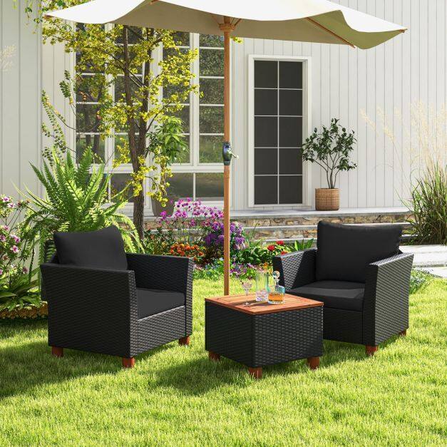 This outdoor conversation set includes 1 coffee table and 2 armchairs that exactly match the space of limited places, so you can place it on the porch or other small places. And the soft padded cushion can’t wait to tell you how comfortable they are. What’s more, the coffee table also can be used as a storage box to offer more storage space in limited places. After days and nights on the porch, this 3-piece outdoor bistro set will still be durable and stable thanks to its colorfast hand-woven PE wicker, rustproof metal frame and solid acacia wood.