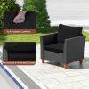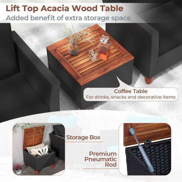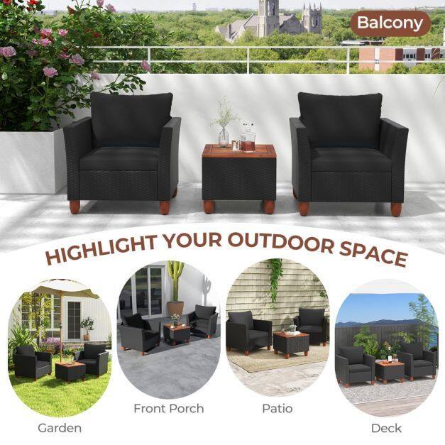 Premium Material and Sturdy Construction This patio porch furniture will accompany you for a long time thanks to its selected materials. The hand-woven black PE wicker takes the advantage of being colorfast and sun-protective. The X-shaped structure boasts the ability to be stable. And the acacia wood makes it sturdy to use.