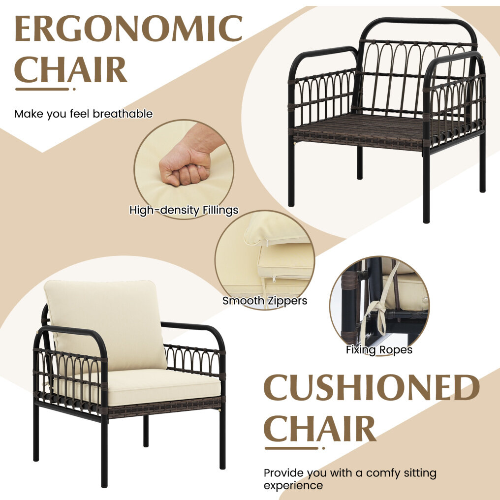 ● Selected PE Rattan: The colorfast and sun-protective hand-woven mix brown PE rattan endows this outdoor conversation set with higher durability to withstand outdoor changing weather.