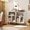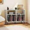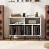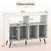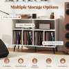 This turntable stand features a wide tabletop to accommodate a variety of turntables. Additionally, two compartments provide additional space for storing audio accessories, magazines, or decorative items. Beneath, you'll find four vinyl storage shelves designed to keep your precious collection organized and easily accessible. Supported by five raised metal legs and two anti-tip kits, this record storage table provides a sturdy foundation for your audio setup. Designed to meet the needs of music lovers and vinyl collectors, this turntable stand is a stylish addition to any space.