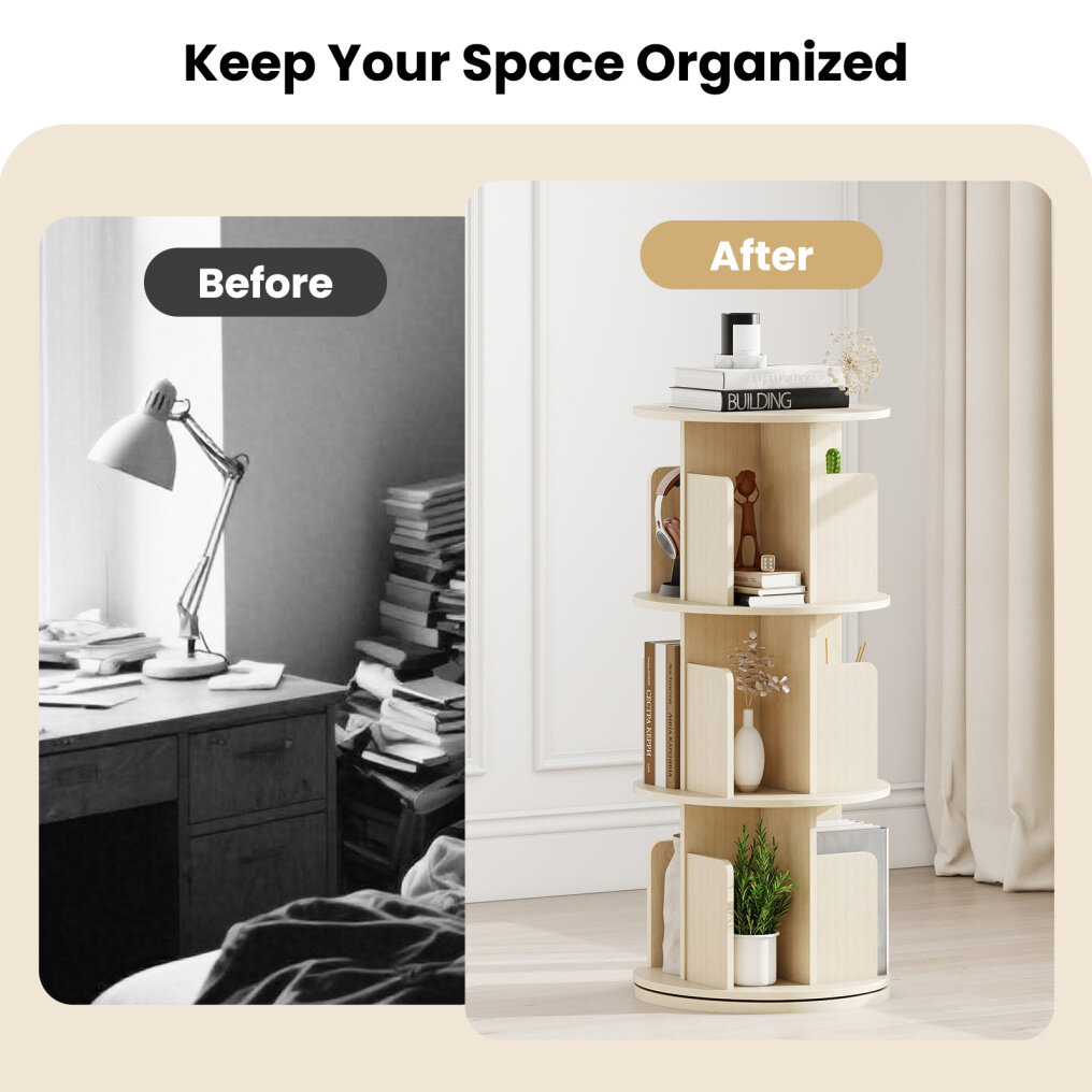 ● Spin, Display and Repeat: The freestanding bookshelf features a 360° swivel plate that enables you to show off your entire collection from every angle. This design ensures easy access from any direction, making it convenient to browse and retrieve items.
