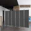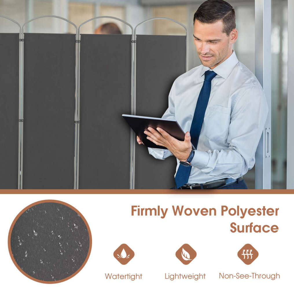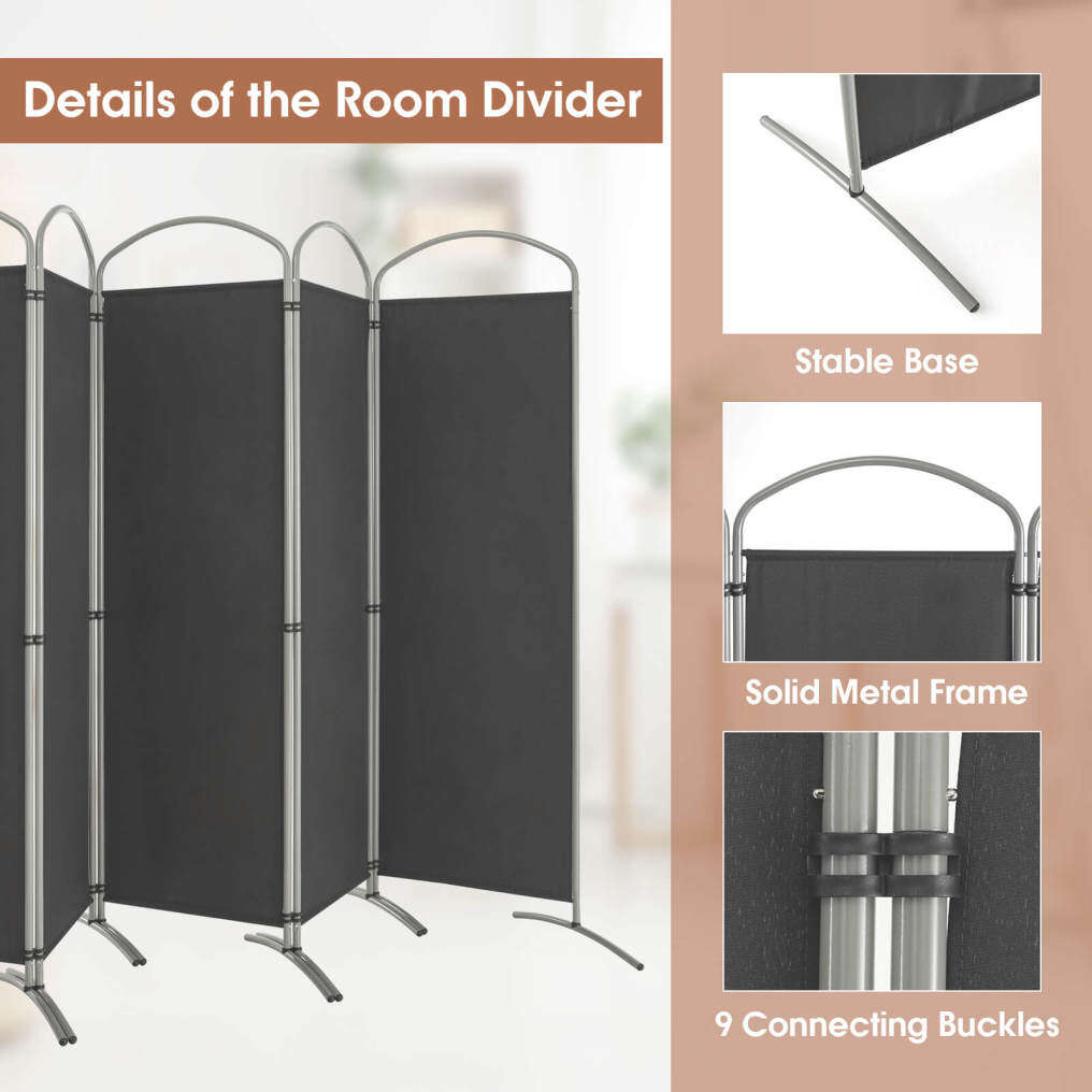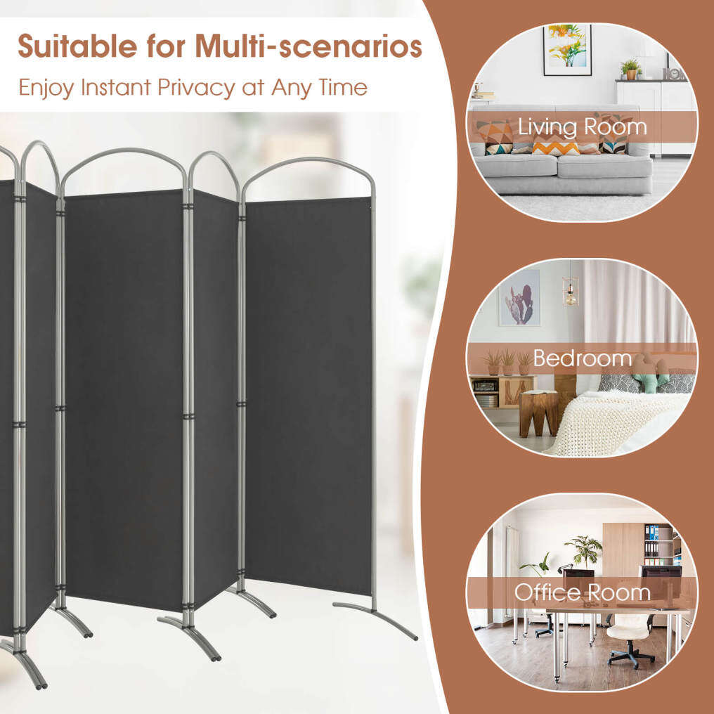 The 6-panel folding room divider is perfect designed to separate the room into different areas and create a private space. Made of premium polyester fabric and supported by metal frame, the privacy screen is characterized by great durability and wear resistance. Considering convenient use, the panel divider can be easily turned either direction or folded up flexibly according to your needs. In addition, its elegant design will perfectly match well with other furniture and add aesthetic beauty to your living surroundings, whether in home, office, hotel, school, and hospital.