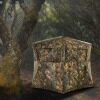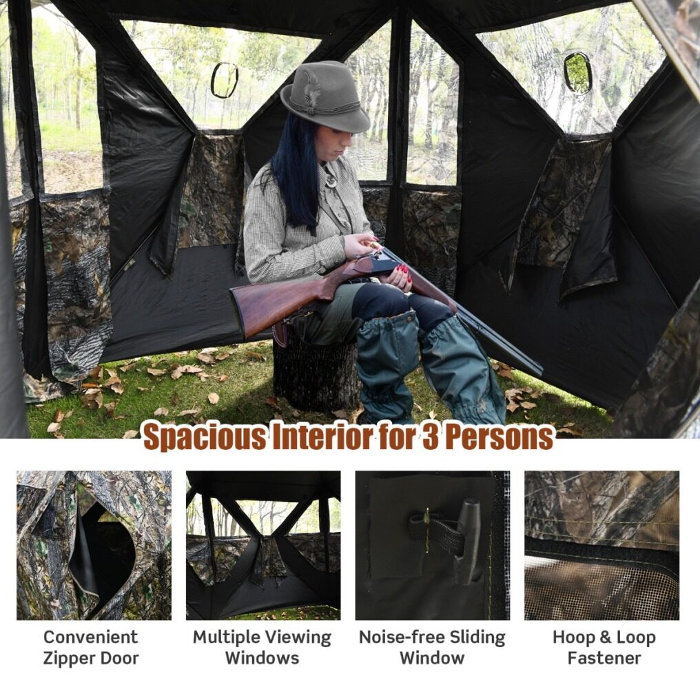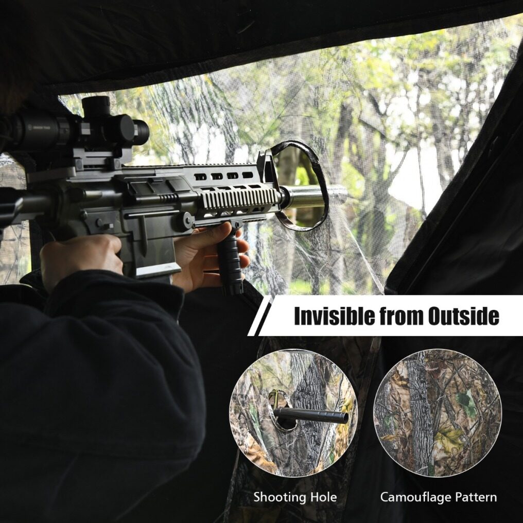 Maximum Field of View: This hunting blind has large detachable mesh windows on 3 sides of the blind, providing you a wide view to watching your prey. Each window has a non-transparent window screen inside the blind, helping you not to be seen by prey. Detach the mesh window and you can shoot freely.