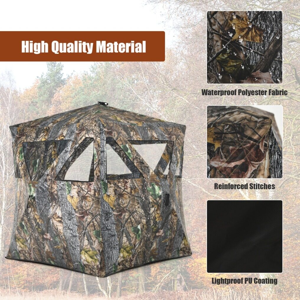 Stable & Durable Structure: The frame of the hunting blind is made of robust fiberglass rods, which are lightweight yet robust enough to support the tent. Covered by thick polyester fabric, the blind surface is wear-resistant and waterproof to withstand outdoor weather and scratches from branches. But we still recommend you hunt another day if the weather is nasty.