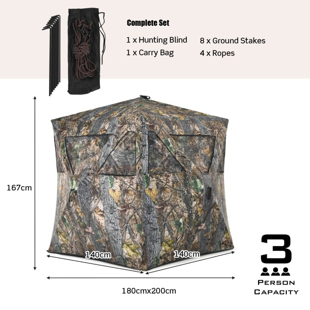 Ample Inner Space: Measuring 180 x 200 x 166 cm, this hunting tent can conceal at most 3 persons. You and your hunting partner won’t feel constrained in the tent. With silent window screen buckles, people inside the hunting blind can look through any window without loud noise and access their hunting equipment freely.