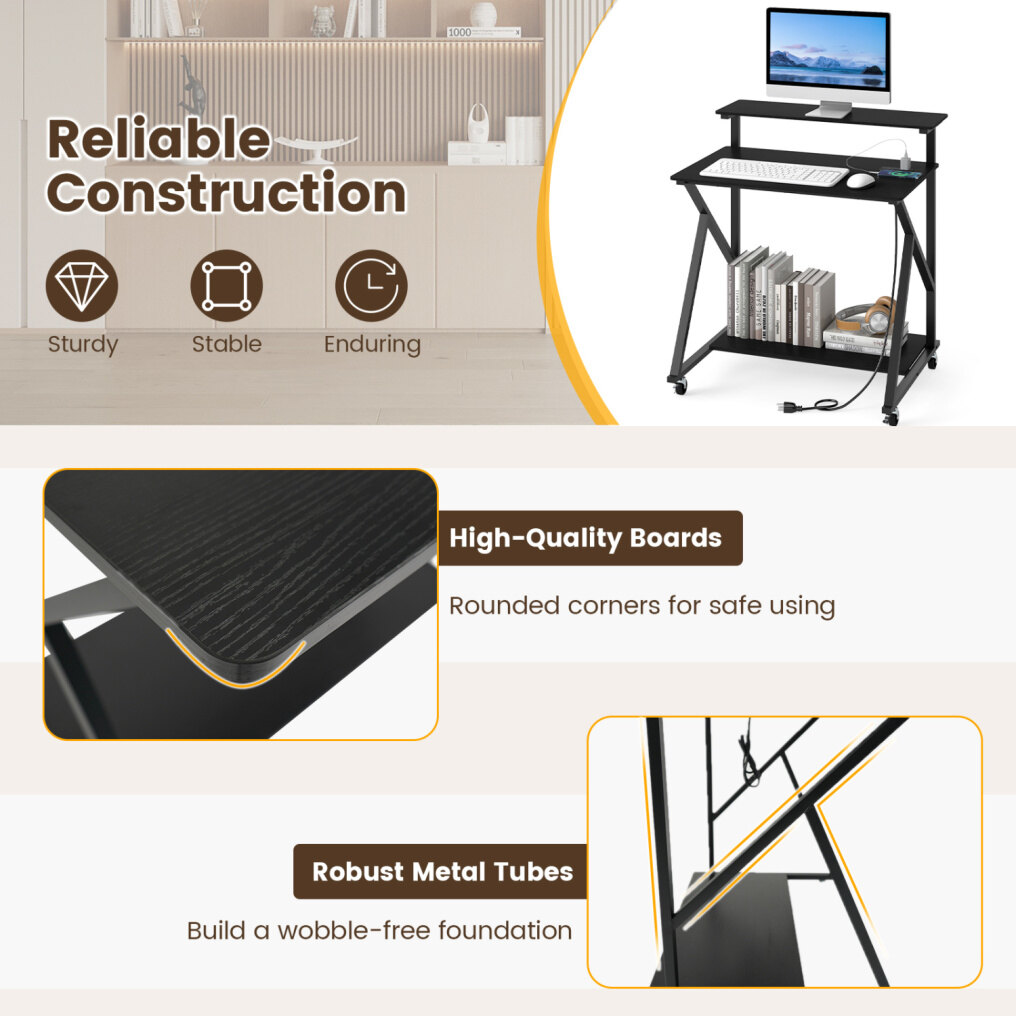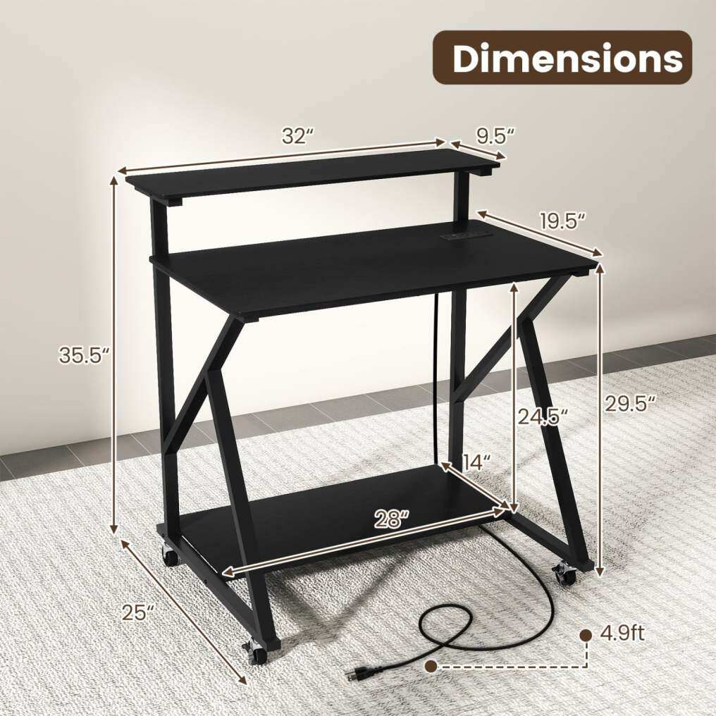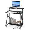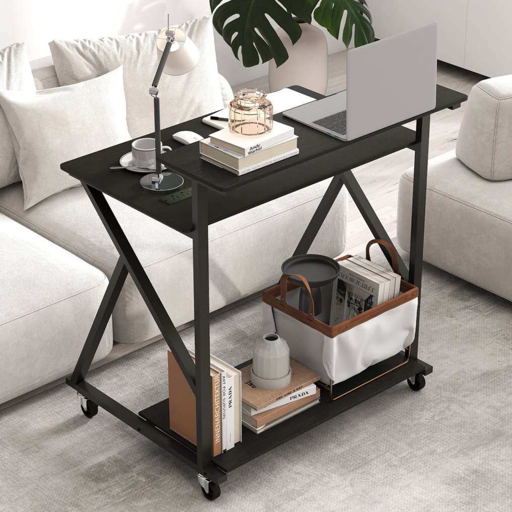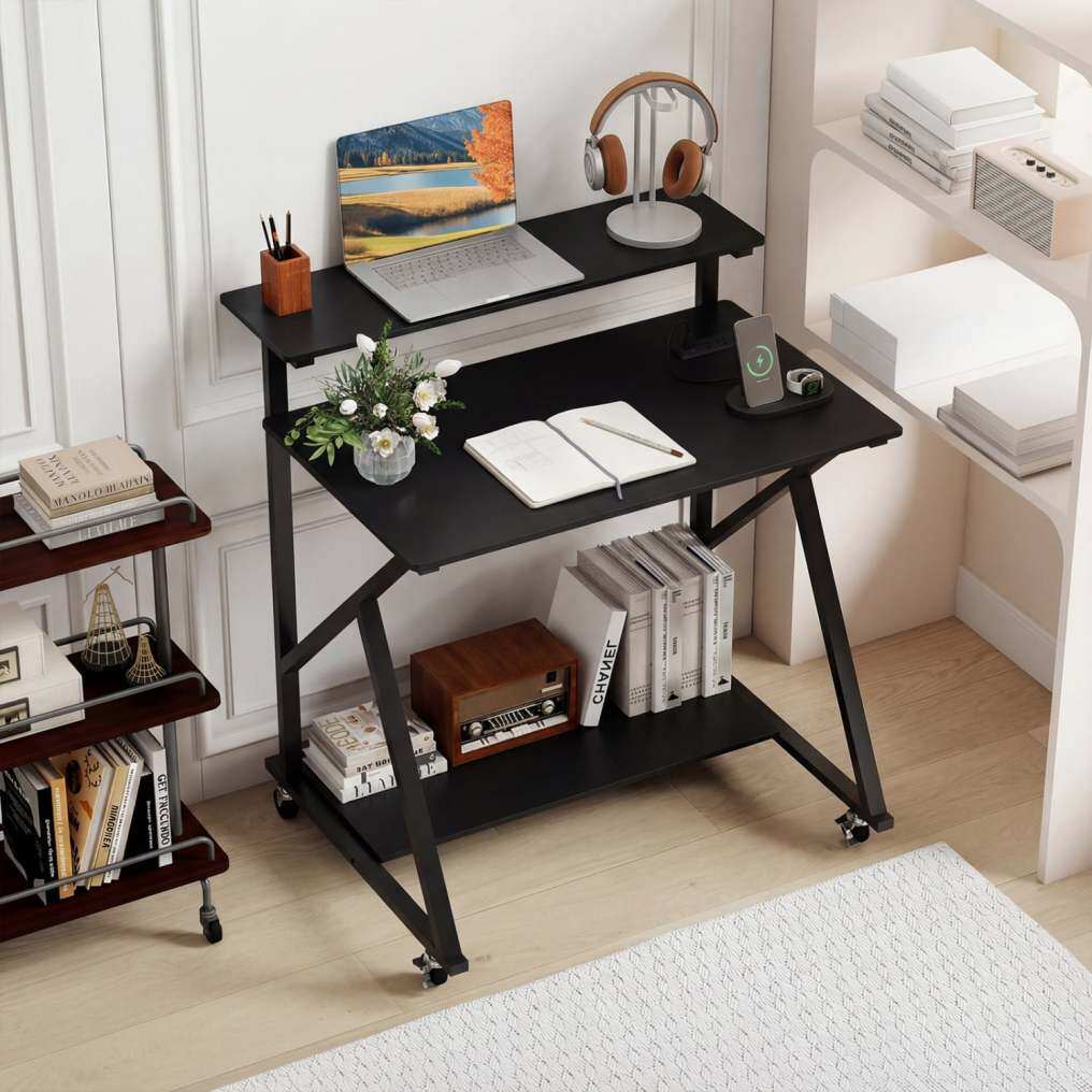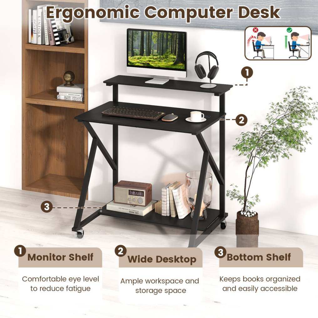 ● Clever Storage Solutions: The monitor stand on this rolling laptop table lifts your screen to a comfortable eye level and opens up extra desktop real estate for keyboards, notebooks, or coffee. Beneath the work surface, a bottom shelf swallows a computer tower, printer, or stack of textbooks, so your small computer desk stays clutter-free and productive.
