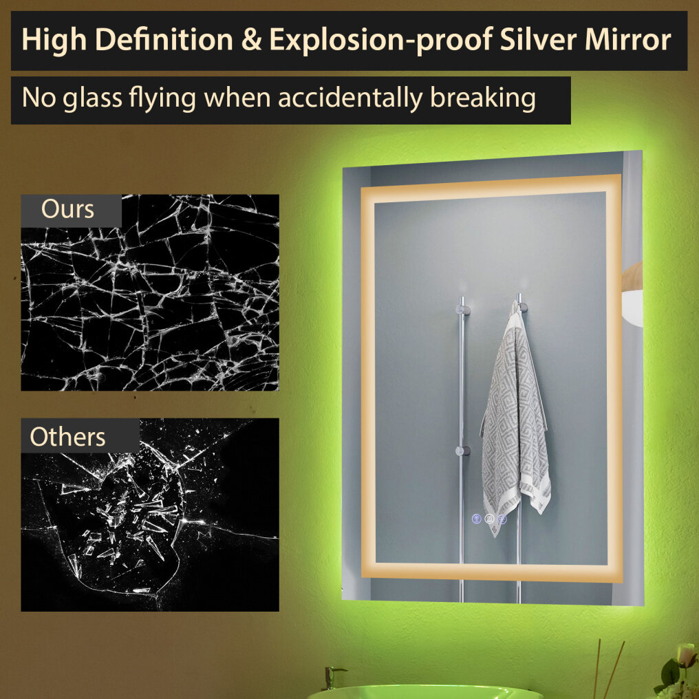 ● Adjustable Frontlit and RGB Backlit: This lighted bathroom mirror provides you with multiple color selections. There are 3 light modes for front light: cold light 6000K/white light 4500K/warm light 3000K and 8 light modes for backlight: cold/white/warm/colorful/pink/red/green/blue.