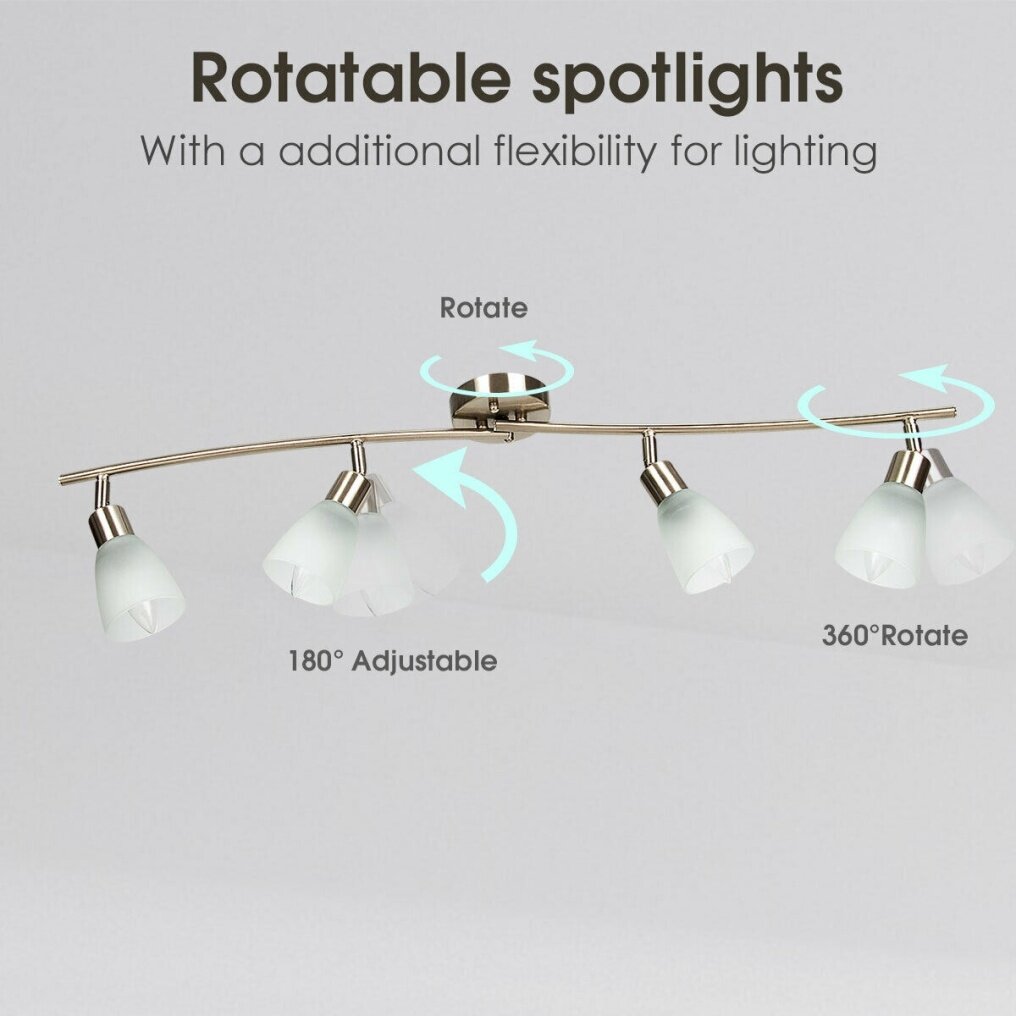The special lampshade makes it ideal for multiple styles of decoration. Thus, you can install it at home, mall or cafes. 4 180-degree rotatable lamps and 4 360-degree rotatable luminaries greatly expand the range of illumination, allowing you to read or learn at night. Besides, made of high quality iron, the track light have a sturdy frame. The surface's sand-nickel coating improves durability and corrosion resistance and extends lamp's service life.
