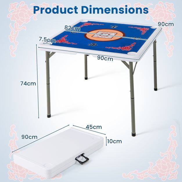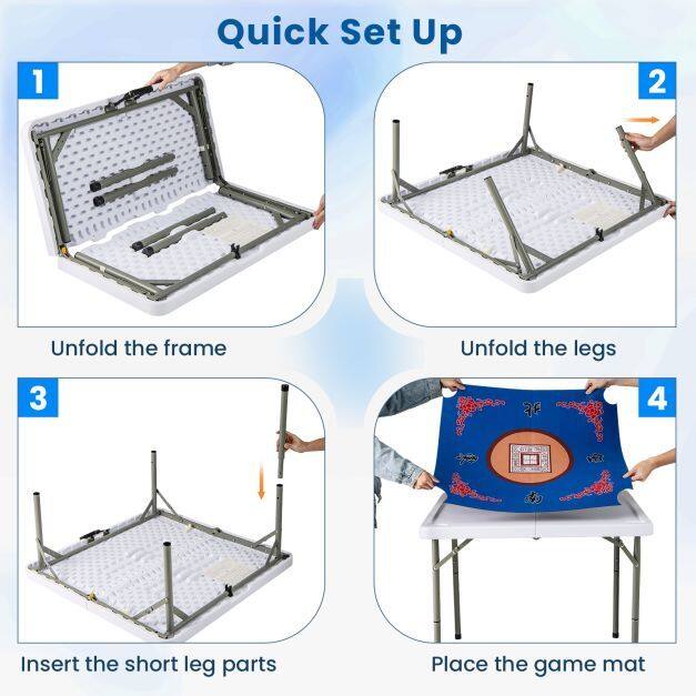● Quick Set Up: This portable mahjong table is easy to set up. Just unfold the frame and legs, and insert the short leg parts, and finally place the game mat, and you're ready to play. The overall dimensions are 35" x 35" x 29" (L x W x H).