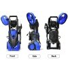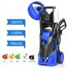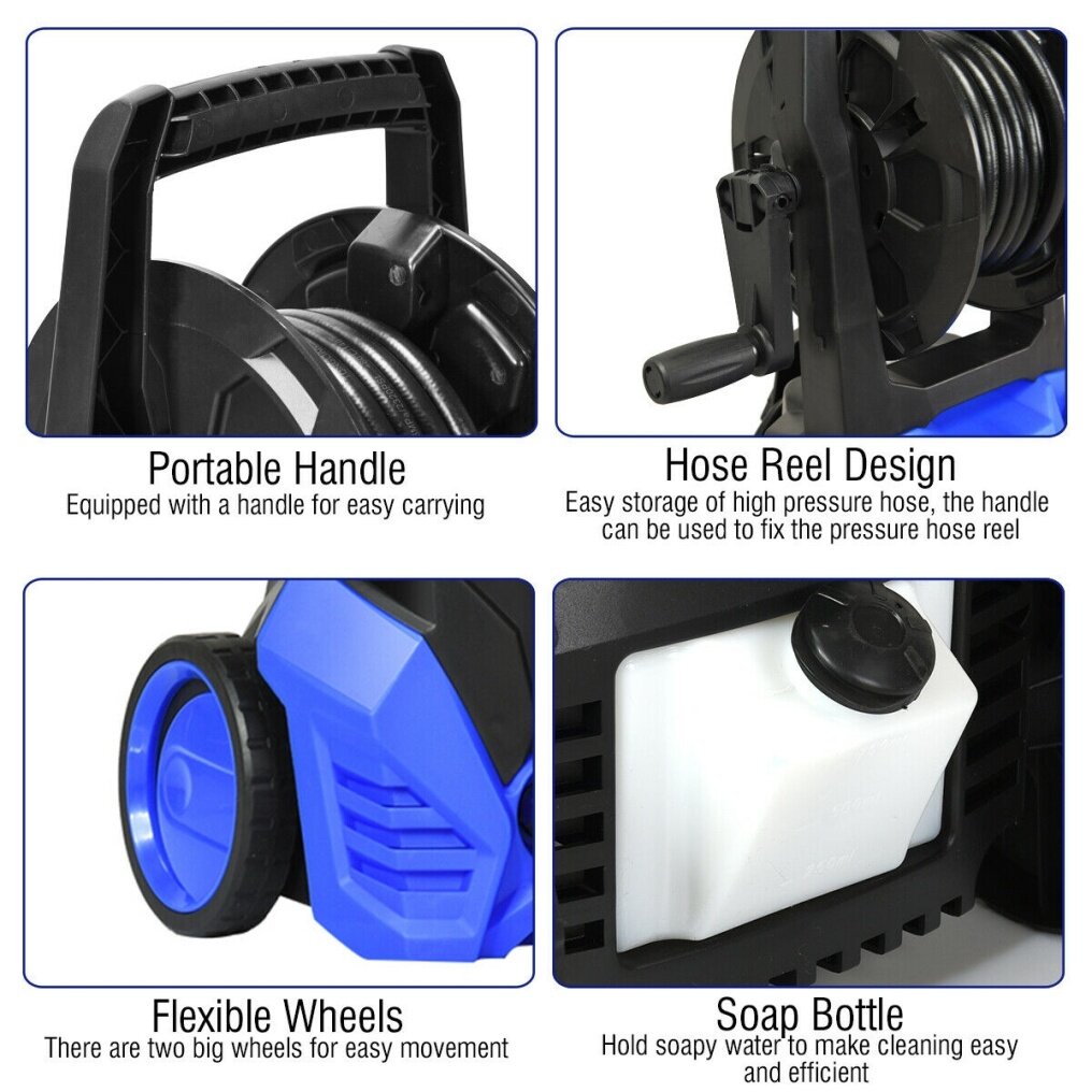 Powerful motor provides maximum 3000 PSI and 2.0 GPM cleaning power. With five interchangeable nozzles(0°,15°, 25°,40 °and soap), You can use it to tackle a variety of cleaning tasks, such as homes, buildings, RV's, cars, trucks, boats, decks, driveways, patios, and etc. Features automatic total stop system, when the trigger is not engaged, the motor will shut off automatically. Equipped with a pressure hose reel to store and protect the 26 ft(8m) pressure hose conveniently and you can fix the pressure hose reel with the handle of the reel.