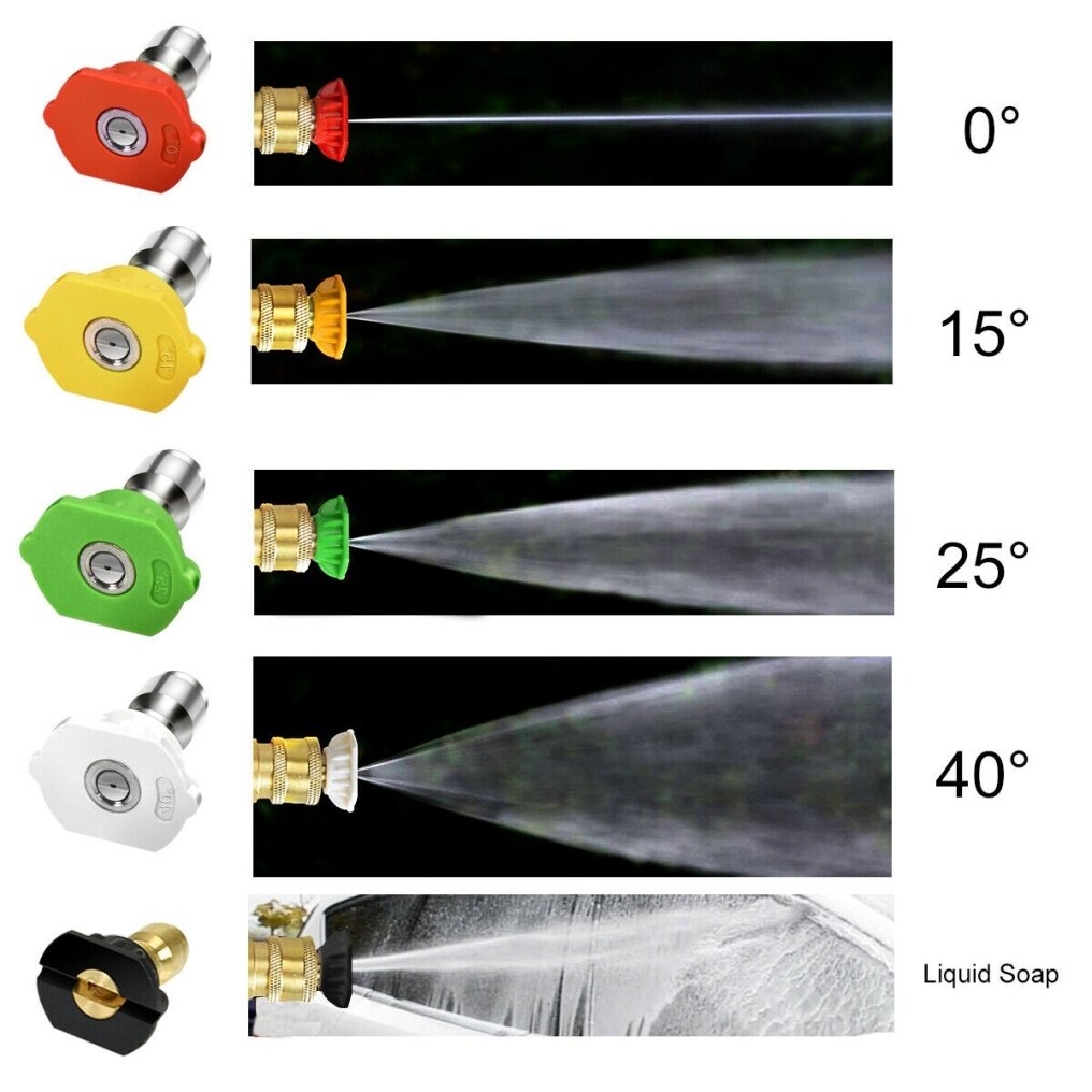 - 5 Interchangeable stainless steel nozzles wash various surfaces