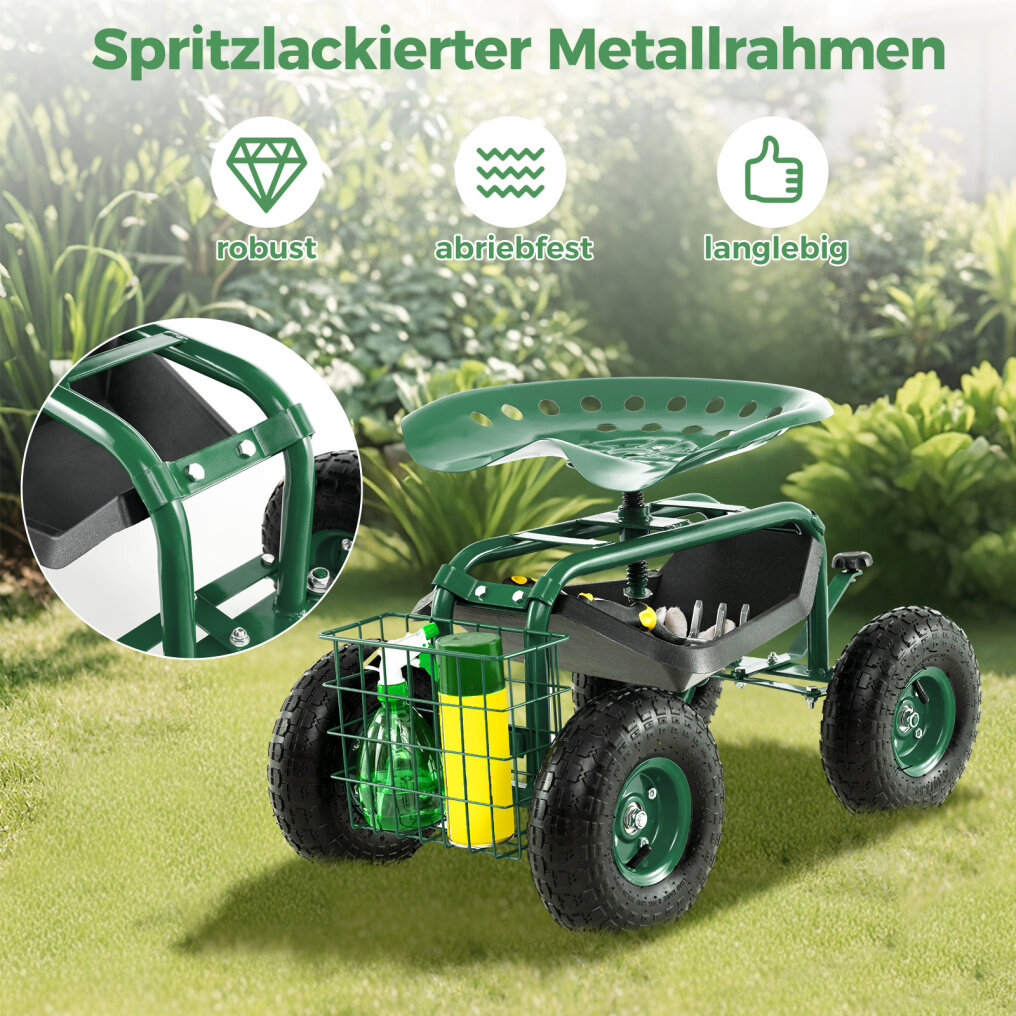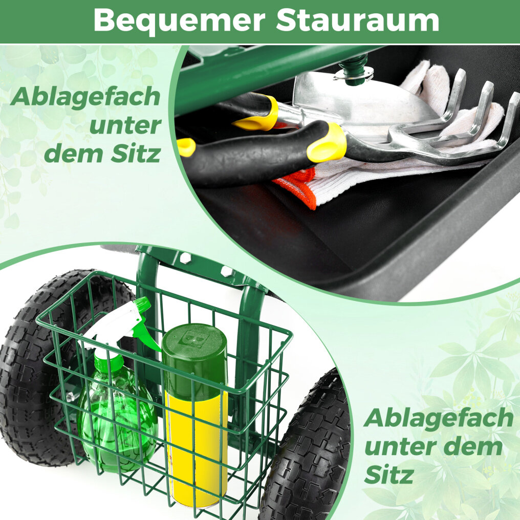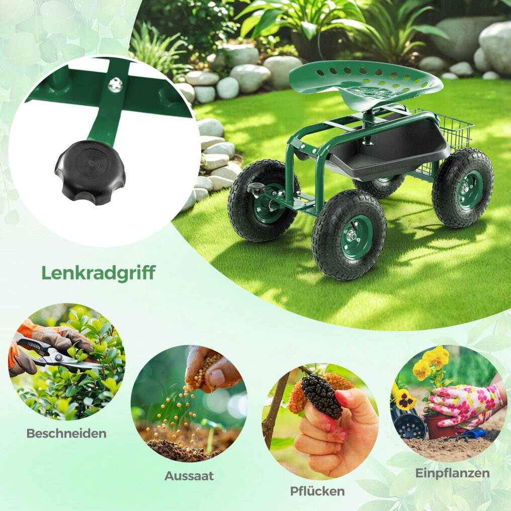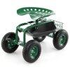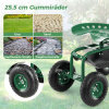 This versatile garden cart is built to last and is constructed from heavy-duty metal and inflated rubber tires. Finished with a green powder-coated finish, it will be a stylish addition to your garden. The garden cart features a steerable handle with adjustable height, allowing people of different heights to maneuver it easily. Additionally, the cart features an ergonomically designed seat for a more comfortable working experience. A black storage tray is located under the seat, and a storage basket and shelf at the rear of the cart provide ample space for your planting tools, flower pots, and more.