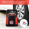 ● Air Compressor and Built-in Inverter: The air compressor is rated for 180 PSI which takes 8 - 10 minutes to inflate a regular car tire to 30 PSI. Meanwhile, it has a needle and 2 nozzles so that it can inflate other inflatables as well. The built-in inverter can supply 120VAC, 60HZ, 200Watts which is able to charge your small domestic appliances, such as lights, cameras, and others.