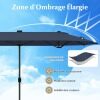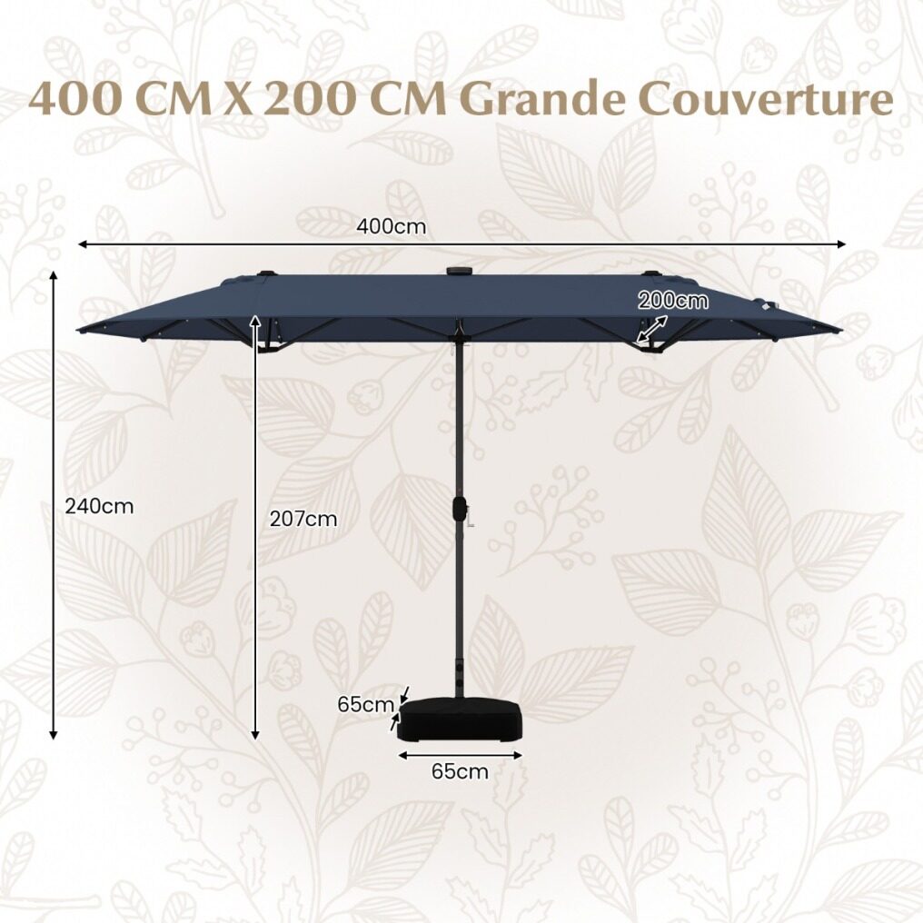 The 400cm rectangular double parasol with 36 solar-powered LED lights can work for 8 hours after a full charge. Featuring yarn-dyed fabric, it won't fade. Coated with PA, it will protect you from light rain and strong sunlight. The thick metal poles and 12 ribs provide sturdiness. The cross base can be filled with 60kg of sand, making it stable to withstand wind. Equipped with a crank, opening and closing are easy. It provides a large shaded area for large gatherings on the patio or in the garden.