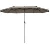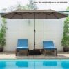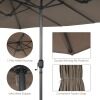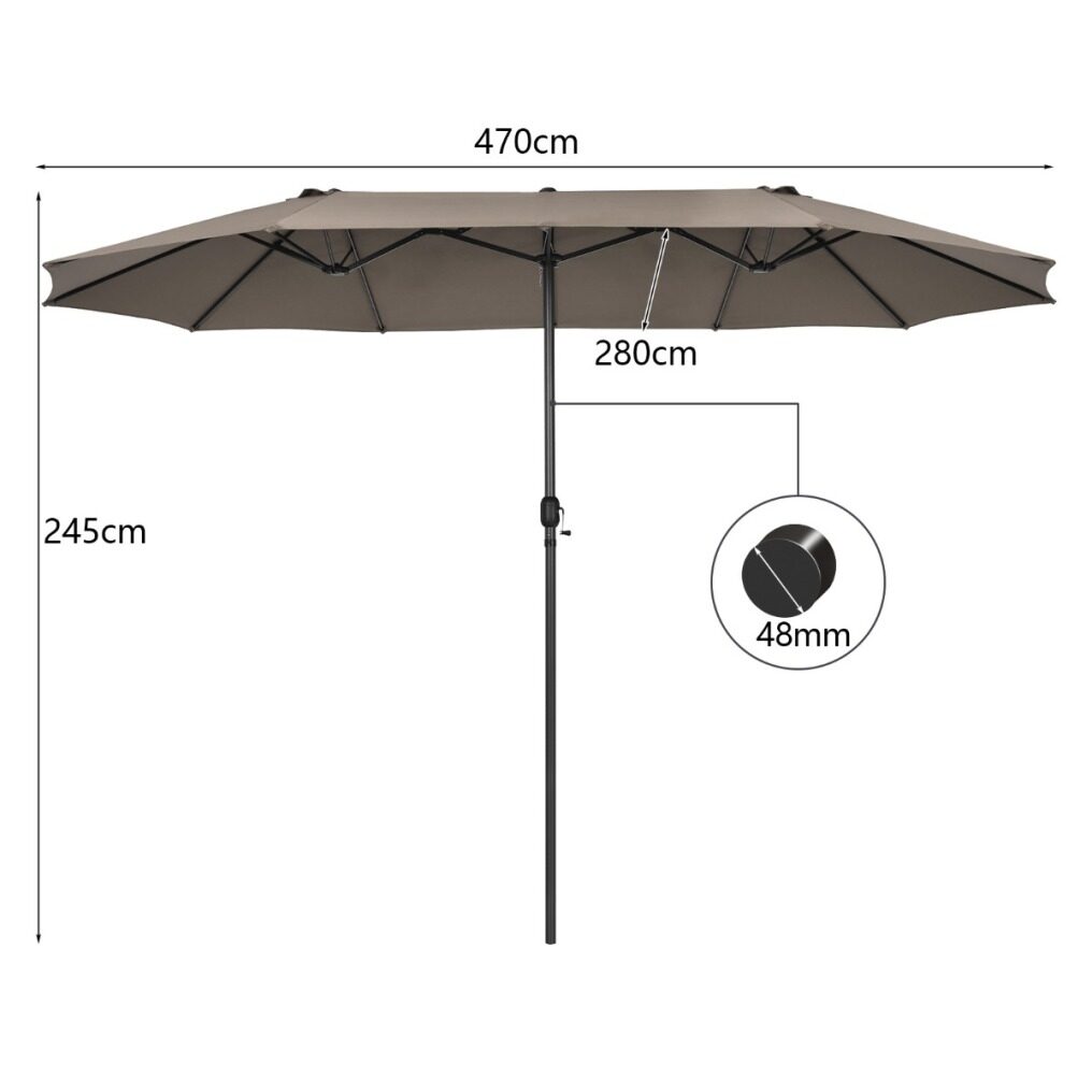 Are you looking for a patio umbrella that will provide you with a shady and comfortable relaxation place? The double-sided patio umbrella is an ideal choice. Crafted with 12 sturdy ribs and thick metal pole, the twin outdoor umbrella showcases firmness and durability. In addition, the market umbrella with double-sided canopy blocks up extra sunlight and creates large shady space. Equipped with convenient hand crank, you can open and close the umbrella smoothly. If the umbrella is not in use, do not forget to tie the fixation strap for longer using life. Following the detailed instruction, you can assemble the umbrella in a few minutes. What's more, the market umbrella perfectly matches with different places, bringing cozy and shady space. (Note: A weighted base (sold separately) is needed for better stability)