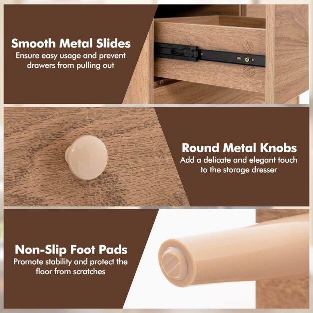 User-friendly Details: The smooth metal slides ensure easy usage and prevent drawers from pulling out. And the round metal knobs add a delicate and elegant touch to the storage dresser. Plus, the non-slip foot pads promote stability and protect the floor from scratches.