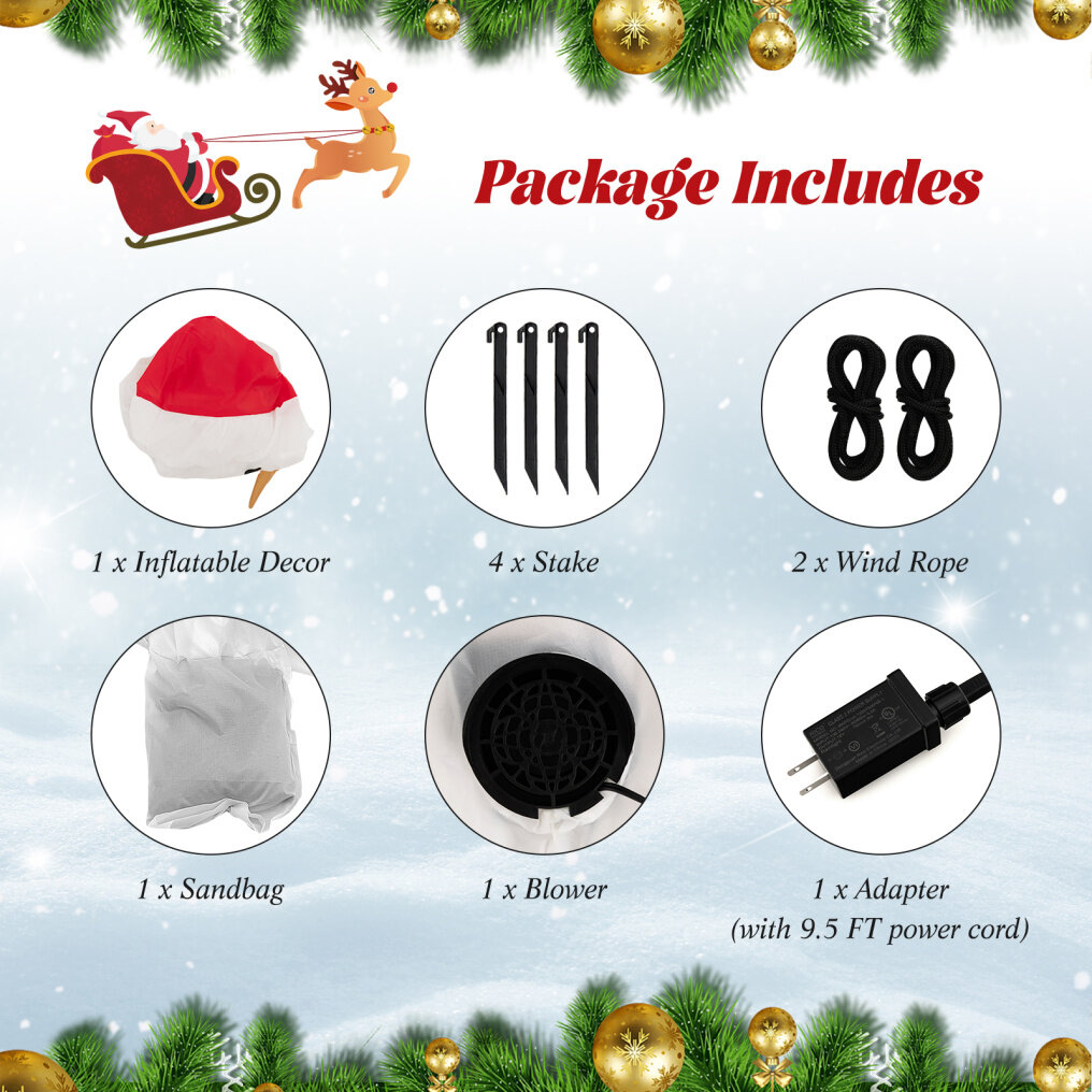 ● Easy and Effortless Installation: The blow-up Christmas decoration can be easily set up in minutes, and all you need to do is zip up, plug into power, tighten ropes, and then stick stakes on the ground. Moreover, it comes with a strong blower, making the inflatables inflate easily.