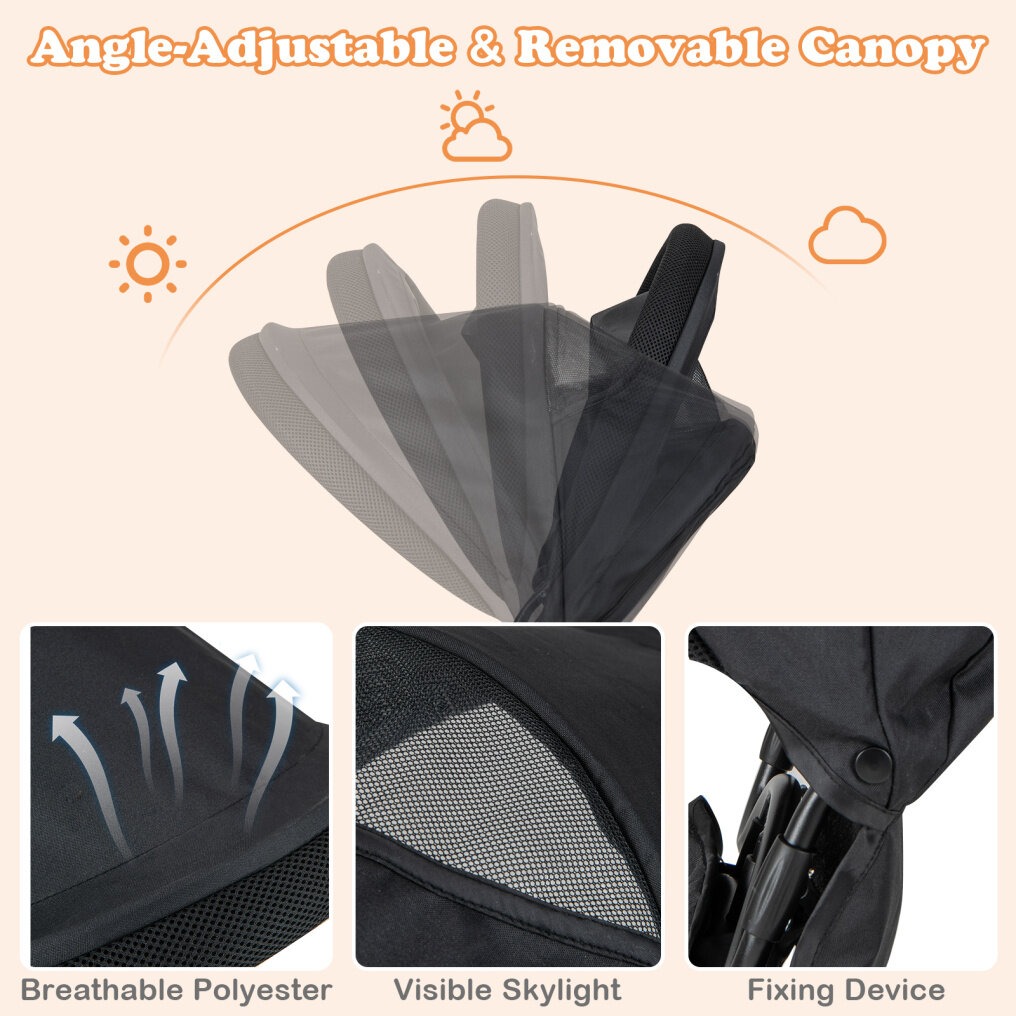 ● Reversible Seat and Adjustable Design: The seat can be reversed for different uses, so that your little one can face inside for better care or face outside for view enjoyment. Besides, the canopy can be adjusted into 2 positions according to different weather conditions. Visible skylight of the canopy allows parents to easily observe their kids.