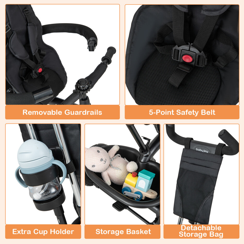 ● 4-in-1 Detachable Toddler Tricycle : The multifunctional tricycle features detachable canopy, seat cushion, guardrail and push handle for easy conversion. You can easily switch it into a toddler tricycle, a seat-reversed trike, a push tricycle or a learn-to-ride tricycle to fit fast-growing kids aged from 9 months to 5 years old. Weight capacity of the seat: 55 LBS.