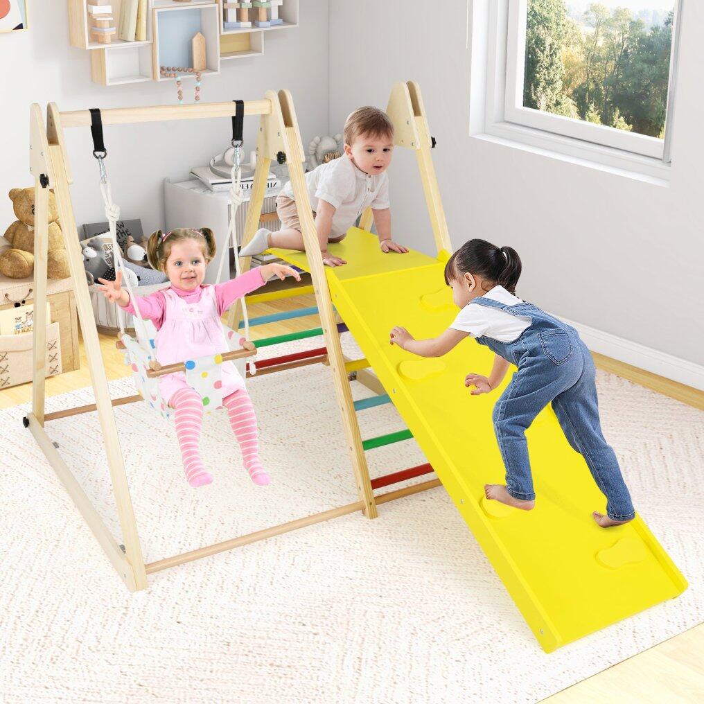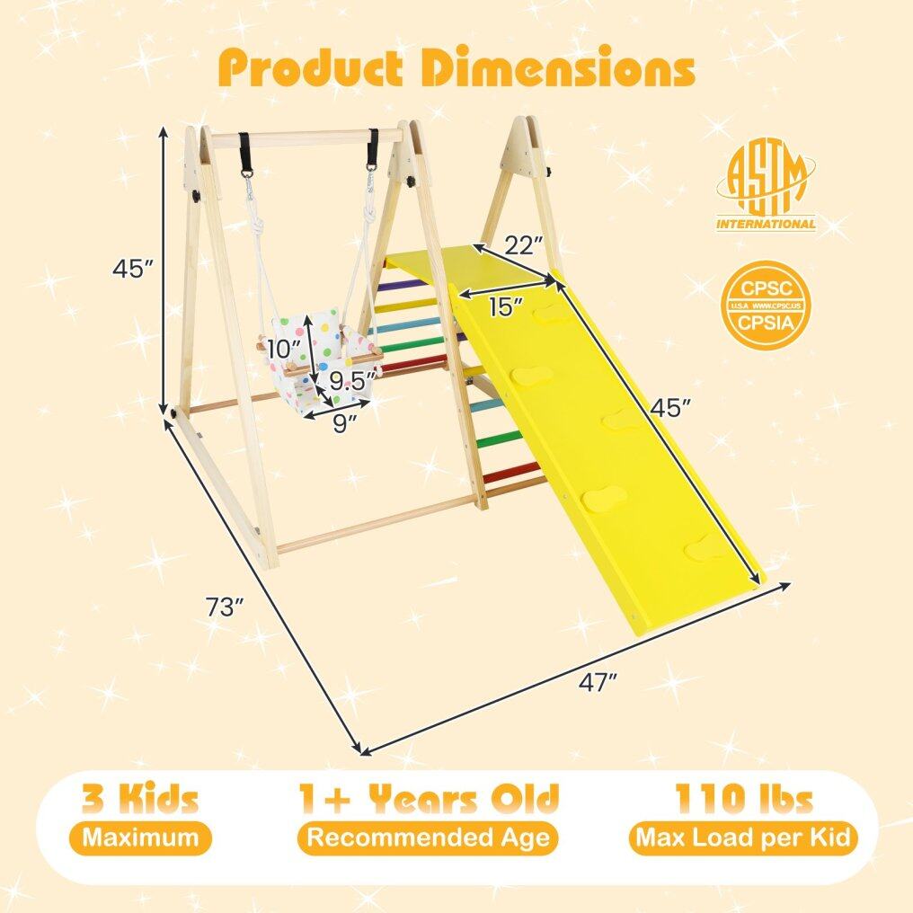 4-in-1 Multipurpose Design: This indoor jungle gym consists of a baby swing, resting platform, climbing ladder and ramp, offering little ones endless hours of fun and physical play. The climbing ramp boasts adjustable height levels, perfect for children’s various needs.