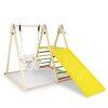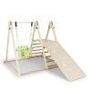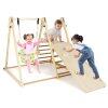 The wooden climber playset boasts a solid wood frame with triangular structures for durability and stability. Featuring a baby swing, resting platform, climbing ramp and ladder, this Montessori climbing set encourages learning through playing, promoting children’s essential development such as motor and social skills. The baby swing is equipped with soft cushions for added comfort, with ad adjustable seat height for flexibility. Also, the climbing ramp can be placed in different positions for various height options. Suitable for toddlers over 1 year old, this wooden jungle gym is a meaningful gift choice.
