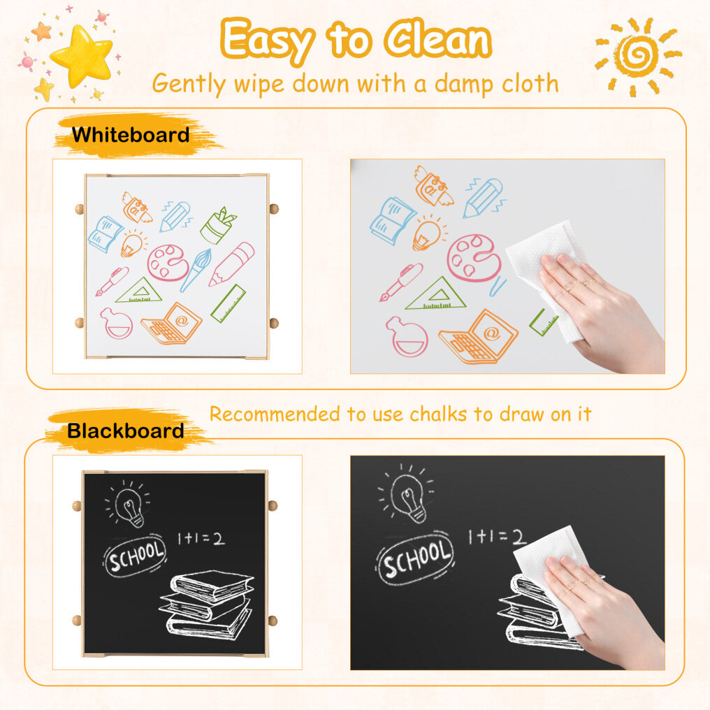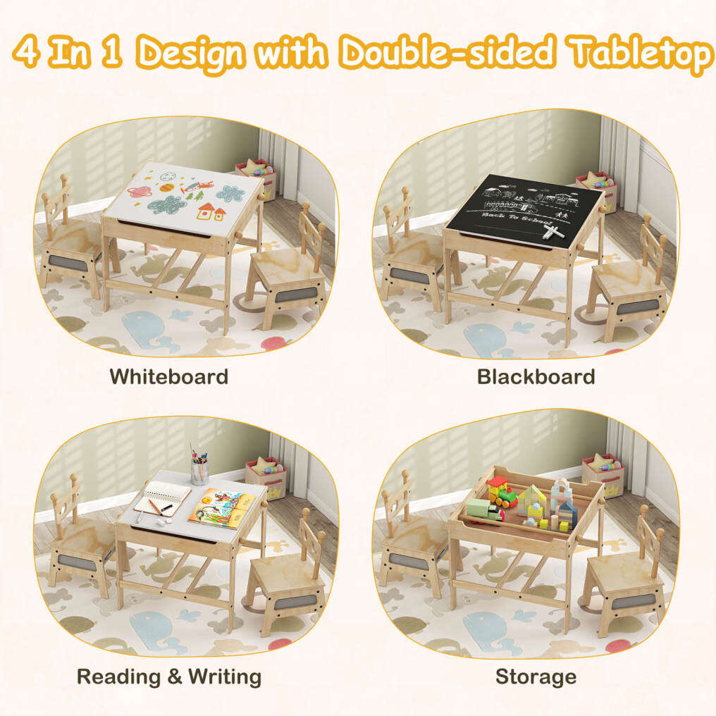 ● 4 in 1 Versatile Activity Table: Featuring a reversible whiteboard (recommended to use chalks to draw on it) and chalkboard, this kids table and chairs set is ideal for arts, crafts, reading, writing, drawing, playing and eating. The thoughtful flip-up groove allows you to easily flap the tabletop or remove it.