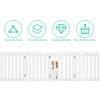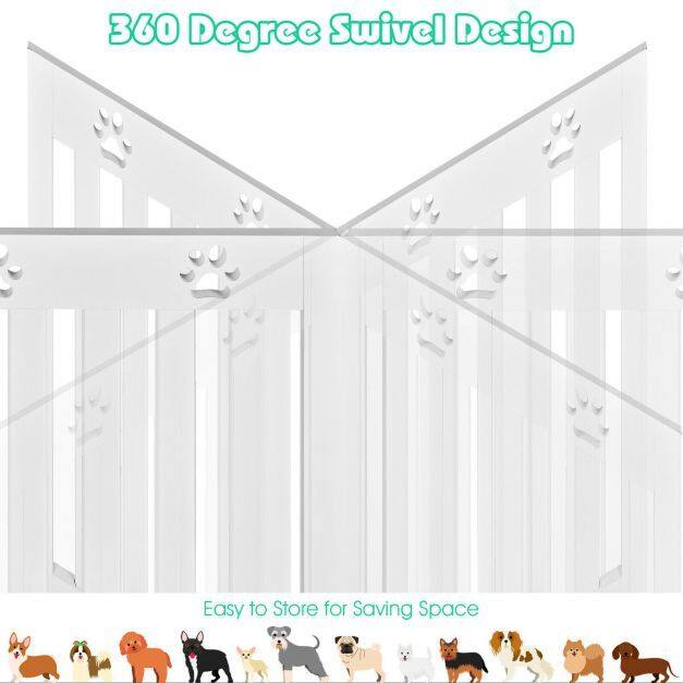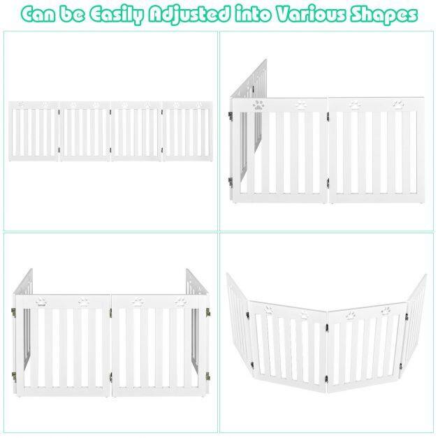 Designed to stop your pet from entering a space they shouldn't, the gate has decorative paw cut-outs on the top of each panel. The spacing between the slats, allows you to watch your pet but are too small for your dog to climb through. The gate is freestanding and can be folded in four to create a smaller gate. Anti-slip foot pads are on the bottom of each panel adding stability and the gate has been covered with a non-toxic waterproof stain. Suitable to be used in doorways, the bottom of the stairs, or as a barrier in front of a bookcase or shoe rack etc. Easy to assemble following the instructions provided.