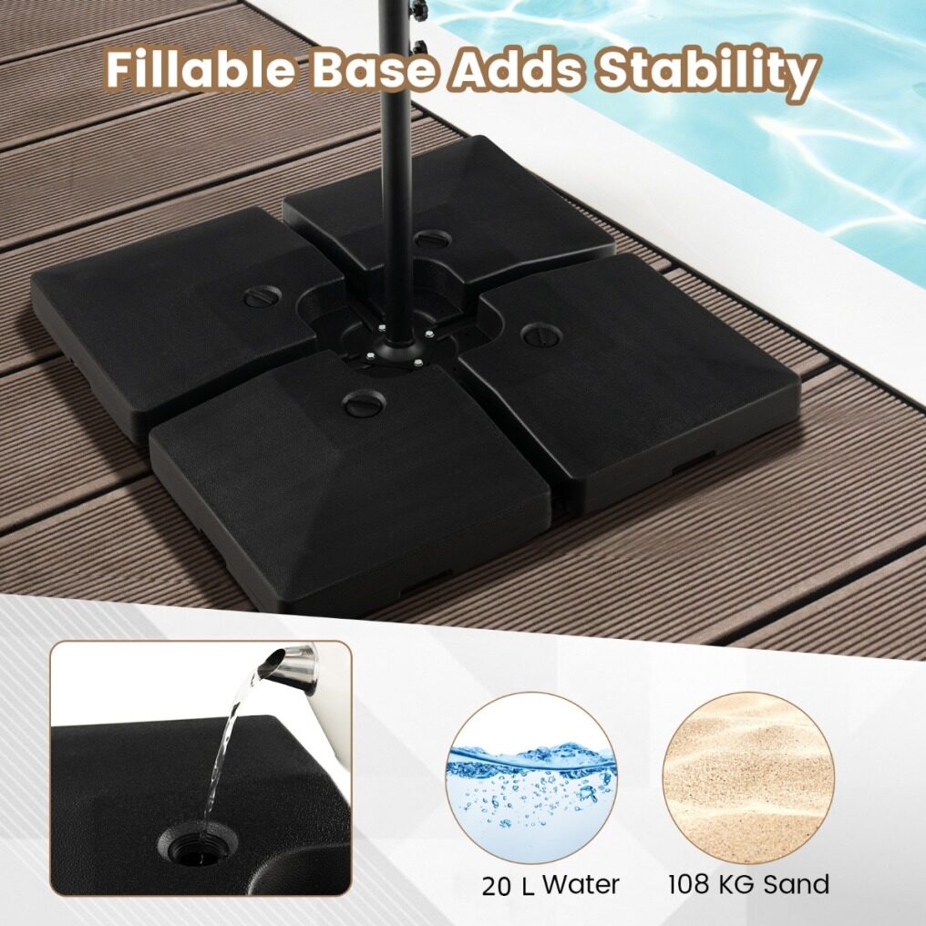● Fillable Base Adds Stability: Each plate can be filled with 5.3 gal water or 240 lbs sand to add weight of the base. Therefore, the weighted umbrella base can provide powerful support for your cantilever offset umbrella to endure strong winds.