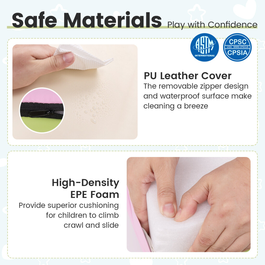 ● Hassle-Free Cleaning: Maintenance is a breeze with PU leather covers, which are soft to the touch and easy to clean thanks to their waterproof surface. You can simply unzip to clean covers for a fresh play environment time after time.