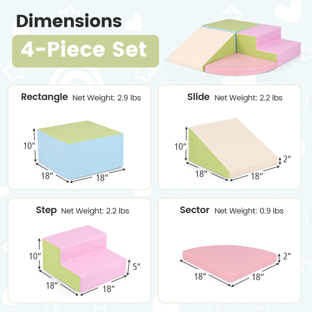 ● Versatile 4-Piece Set: Including a rectangle, slide, step and sector, this 4-piece foam blocks set with ultimate combinations will spark creativity and endless fun for your little one. It is ideal for various indoor spaces, such as home, amusement center, kindergarten, early learning center, etc.
