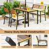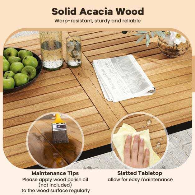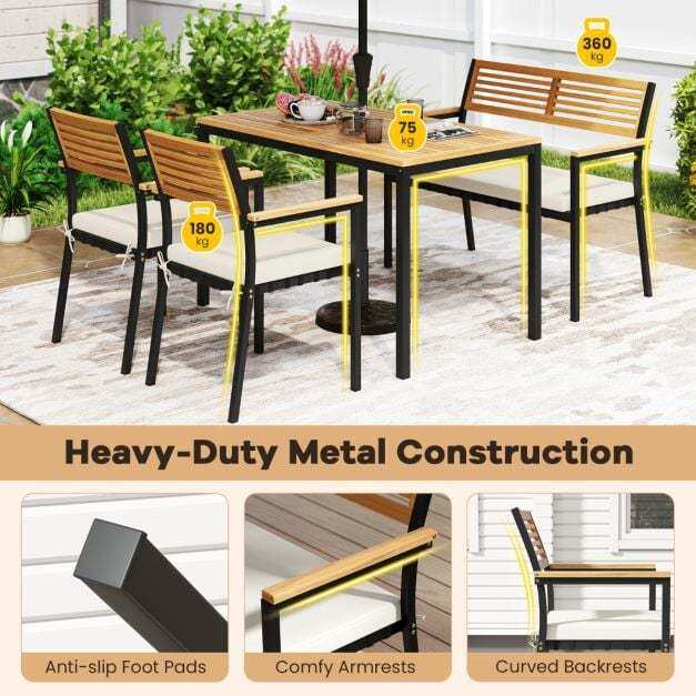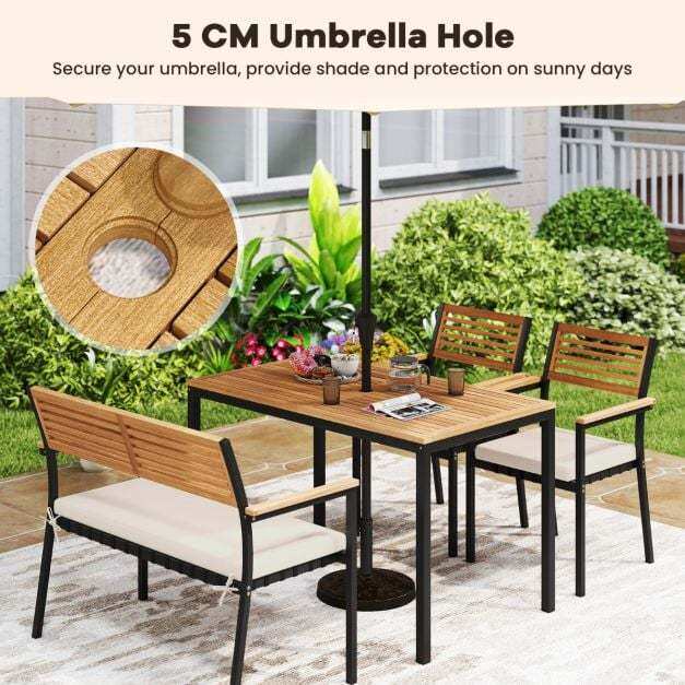 ● Large Wooden Tabletop: This 4-piece outdoor furniture set comes with an expansive tabletop with a dimension of 47" x 27.5" (L x W), proving ample space for food magazines, plants and cups. Besides, the included 1.97" umbrella hole make it easy to attach a shading umbrella (not included).
