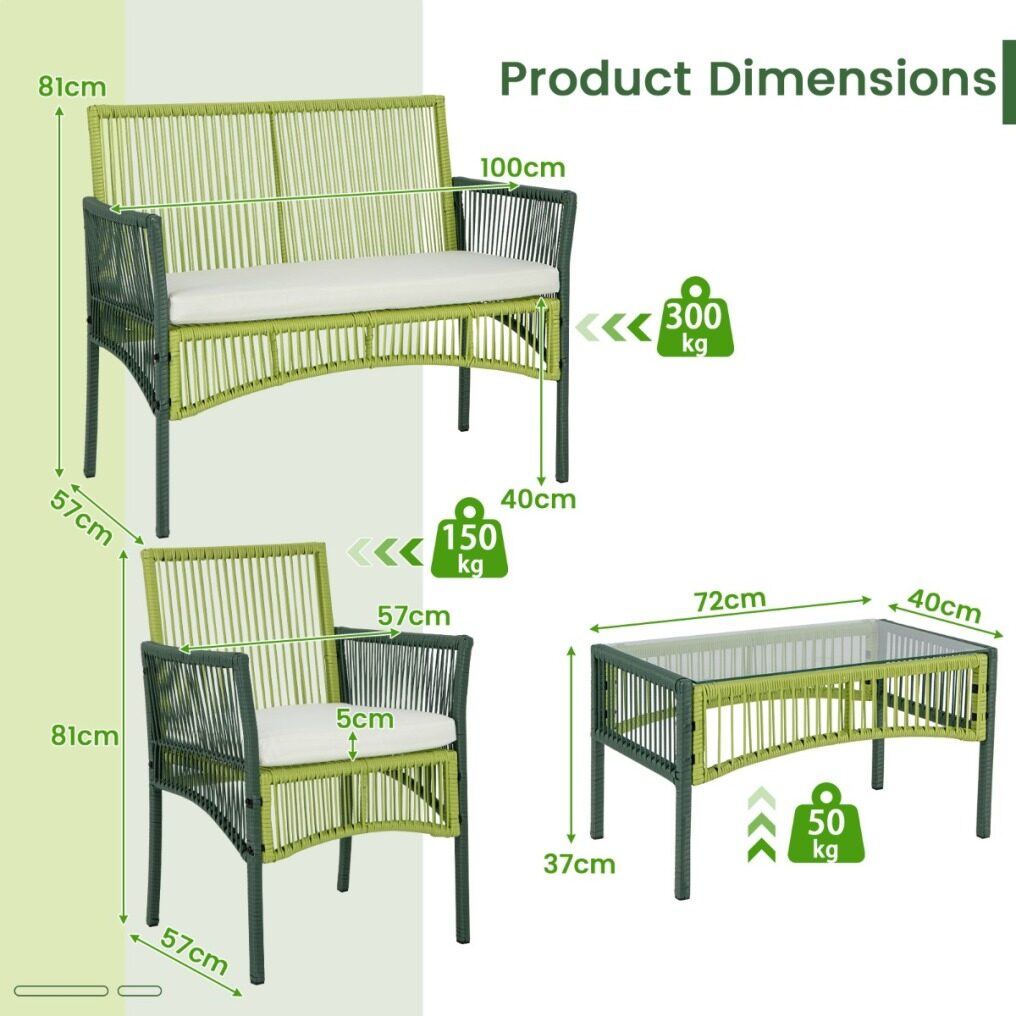 ● Durability in Design: Crafted with a robust metal frame, the entire set is built to withstand the demands of outdoor use. Moreover, the well-woven round PE rattan with a green color is more durable and elegant than normal rattan.