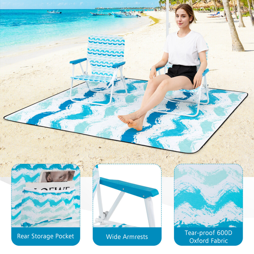 Complete 4 Pieces Beach Set: This comprehensive set features a 195 cm beach umbrella, 2 folding chairs measuring 56 x 51 x 69 cm(L x W x H), and a large 200 x 200 cm beach blanket, configurable in multiple layouts that suit any family outing or social gathering.