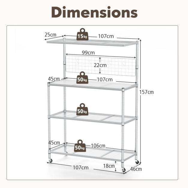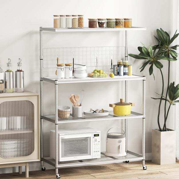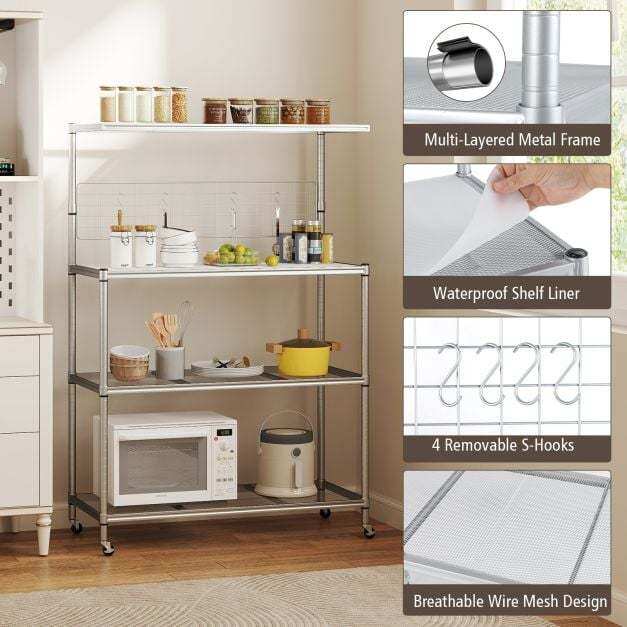 ● Large Storage Capacity: The bakers rack has a wide countertop for your microwave or coffee maker, 3 sturdy shelves for dishes or jars, a versatile hanging net for fruits or vegetables, and 4 detachable S-shaped hooks for hanging utensils, pots, or towels.