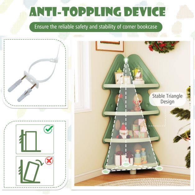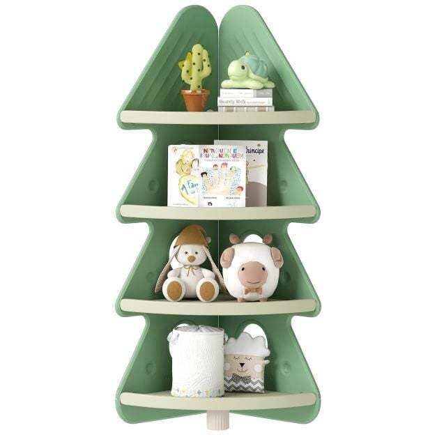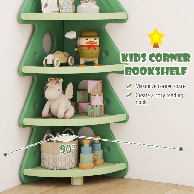 Its clever corner design offers space-saving storage that fits snugly into any room, making the most of every inch. Safe shelves, happy readers. This 4-tier organizer features a comprehensive safety framework for kids' book storage. Crafted with a sturdy triangular frame, reinforced legs, smoothly rounded edges, and a secure anti-tipping kit, it ensures stability and peace of mind. At a kid-friendly 123.5 cm height, little ones can easily access their favorite books and toys. This stylish corner bookshelf balances safety and functionality perfectly. Plus, its straightforward assembly allows parents to quickly create a cozy, organized reading nook that keeps children safe and engaged.