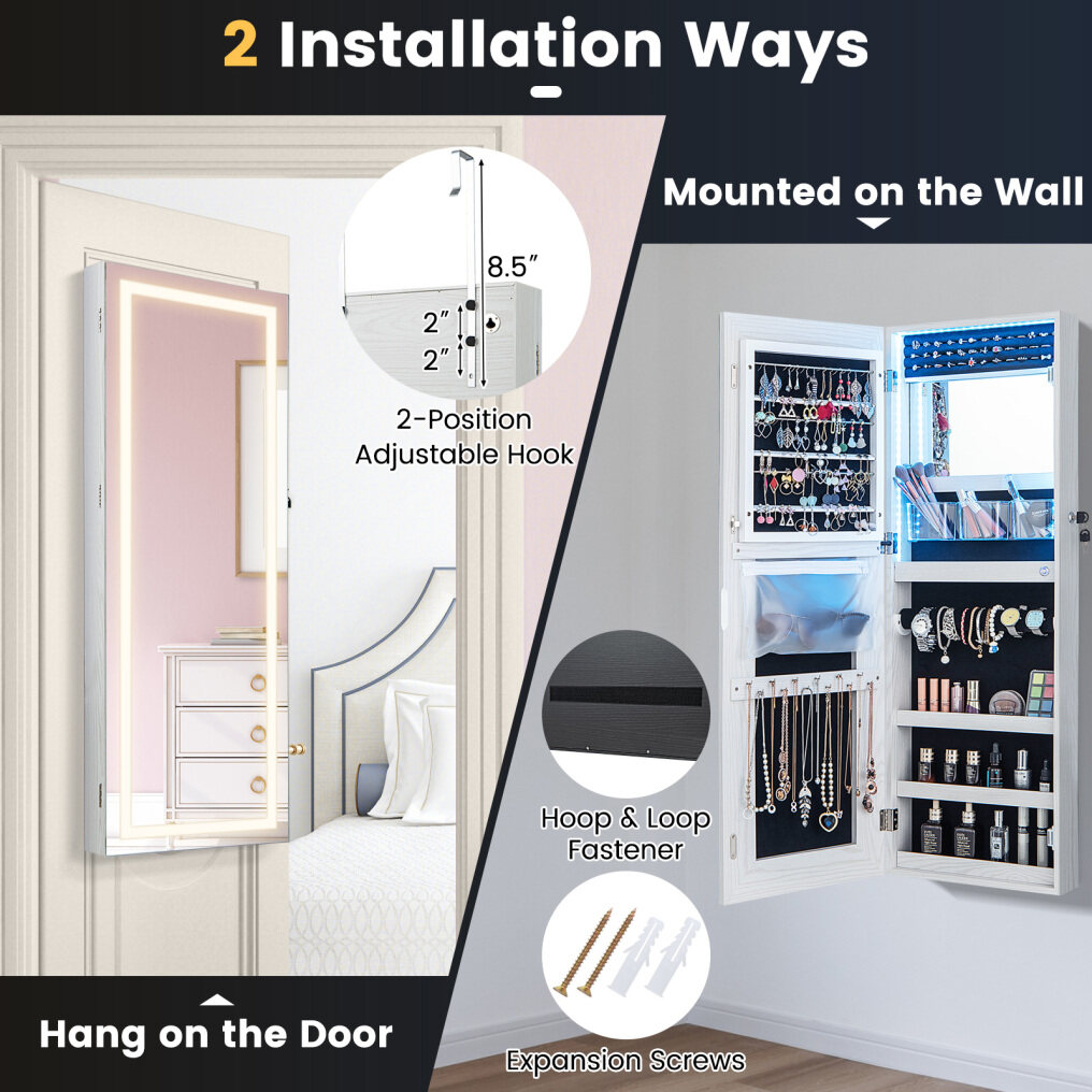 ● Secure and Easy Installation: Features 2 mounting options, this jewelry storage cabinet offers you the freedom to choose the most suitable mounting method. Whether you prefer to hang it on the door or mount it onto the wall, this cabinet provides all the necessary components you required, including stable expansion screws, hoop and loop fastener and adjustable door hooks.