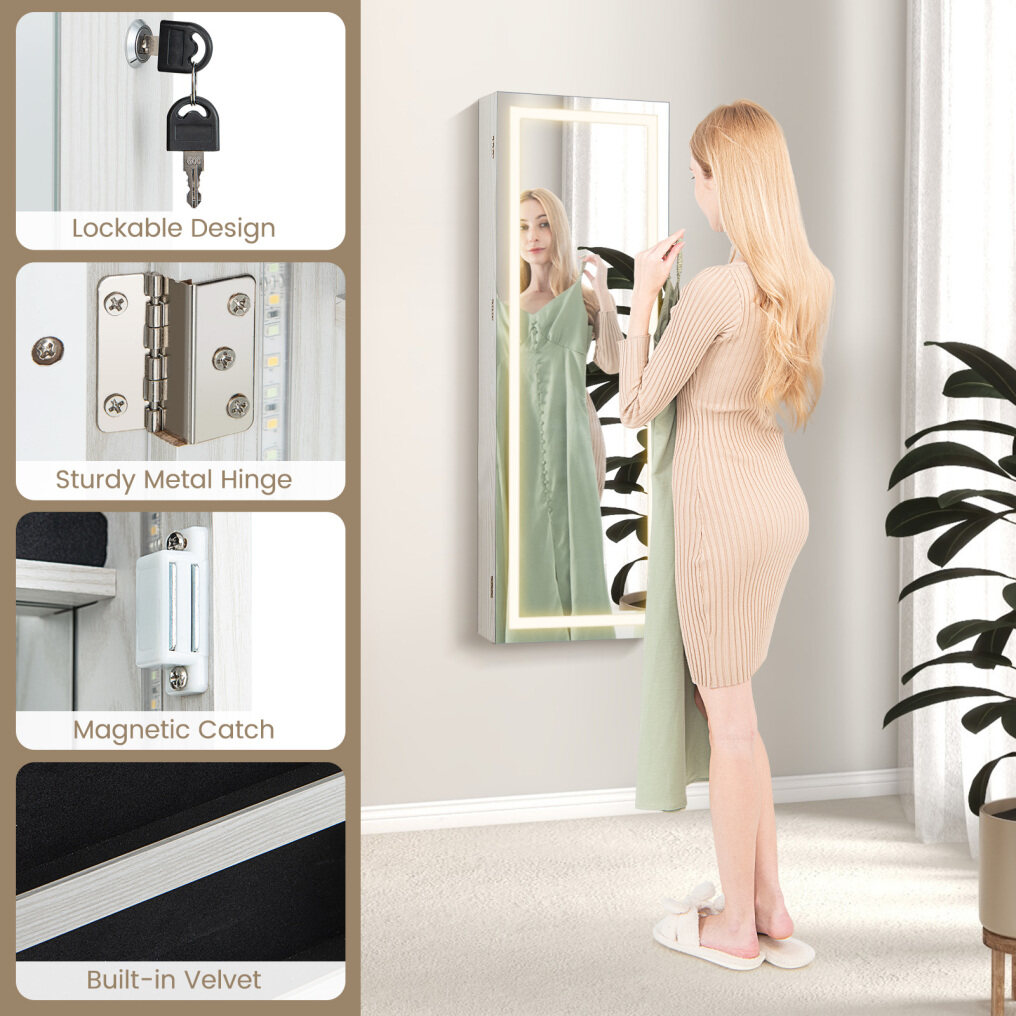 42.5 Inches Lockable Jewelry Mirror Wall Cabinet with 3-Color LED Lights-White