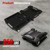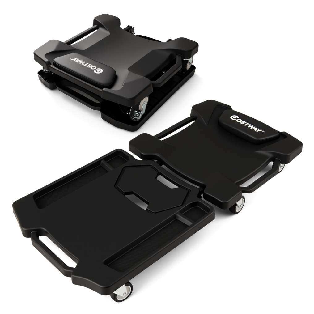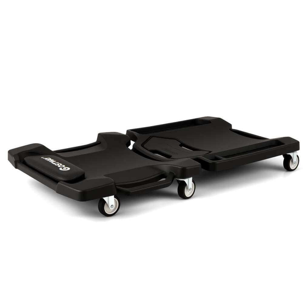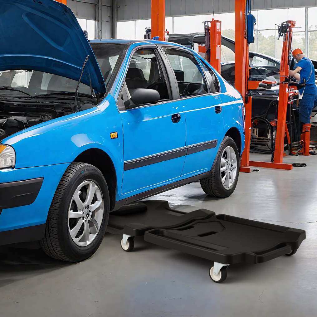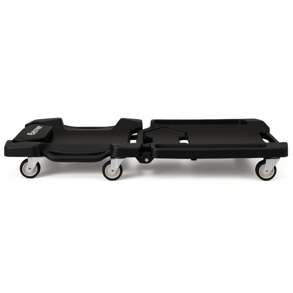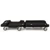 Thanks to its foldable design for easy storage and transport, this assembly dolly is ideal for workshops with limited space. Six universal casters allow smooth 360-degree maneuvering, allowing effortless access to tight spaces. With a load capacity of up to 158 kg, a length of 108 cm, and a width of 55 cm, the dolly offers ample support and space for maintenance work. Its low-profile design, ergonomically padded headrest, and contoured reclining surface ensure maximum comfort. Convenient tool trays are attached to both sides, with the smaller tray featuring a magnetic surface to keep screws and parts safe and within easy reach.