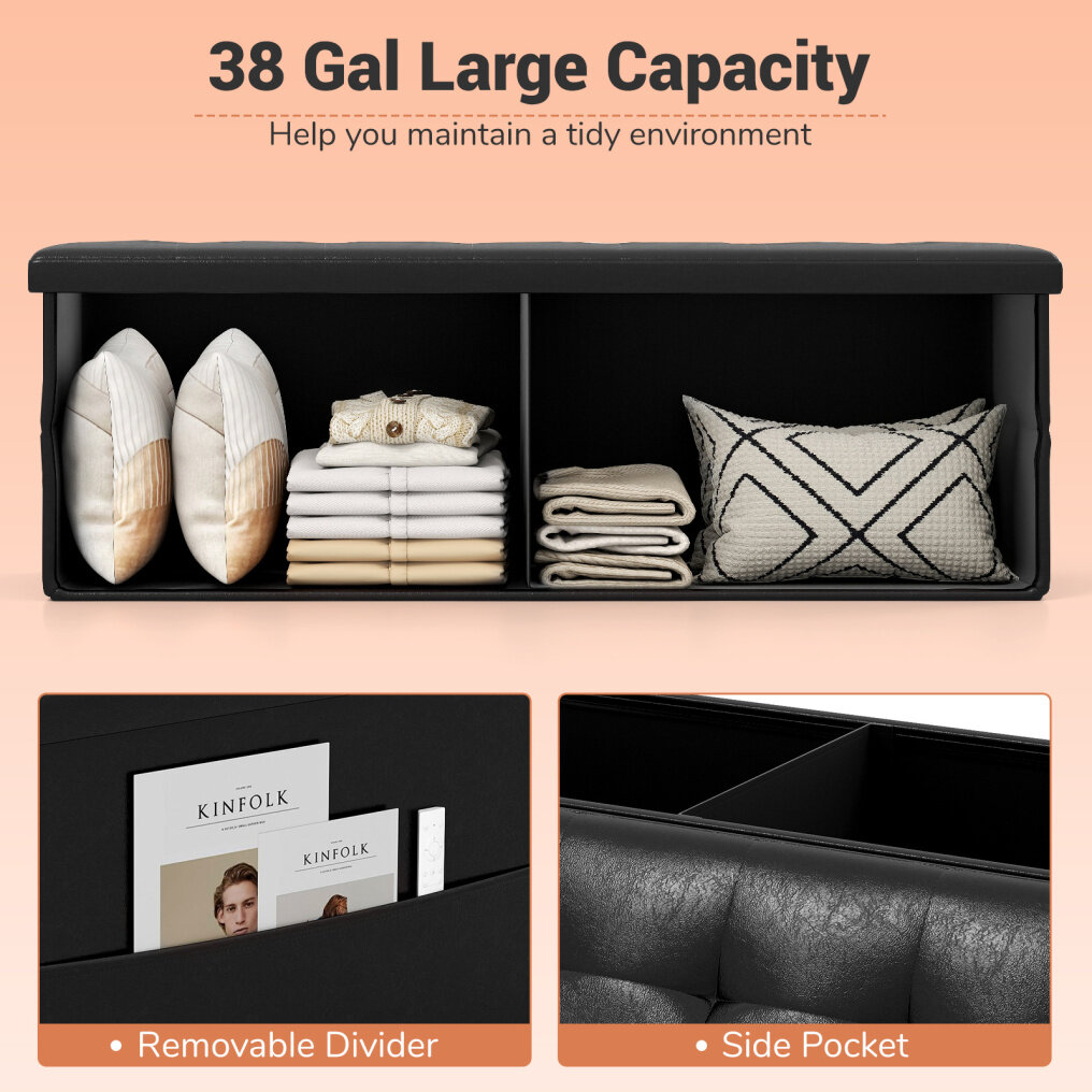 ● 38 Gallon Storage Capacity: This 43-inch storage ottoman with removable divider features a 38 gal capacity, allowing you to arrange inner space to store blankets, cushions and out-of-season clothes. Plus, the side pocket keeps items at hand.