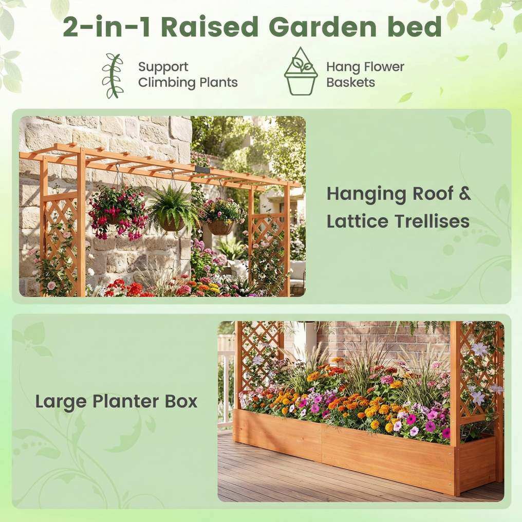 ● Side Trellis & Hanging Roof: 2 side vertical trellis provide sturdy support to allow climbing plants to grow vertically while maximizing space utilization. Hanging roof with extended design creates additional overhead room for hanging basket plants, climbing vines, decorative items.