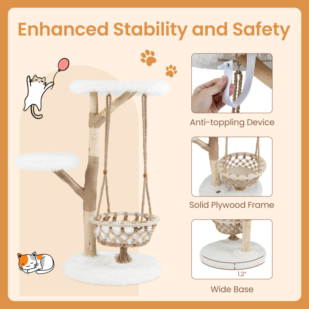 ● Natural Solid Wood Trunk: Constructed with a solid pear wood trunk, this cat tower offers superior reliability, compared to traditional paper tubes. Its unique shape, paired with elegant white cushions, also adds a touch of sophistication to your home decoration.