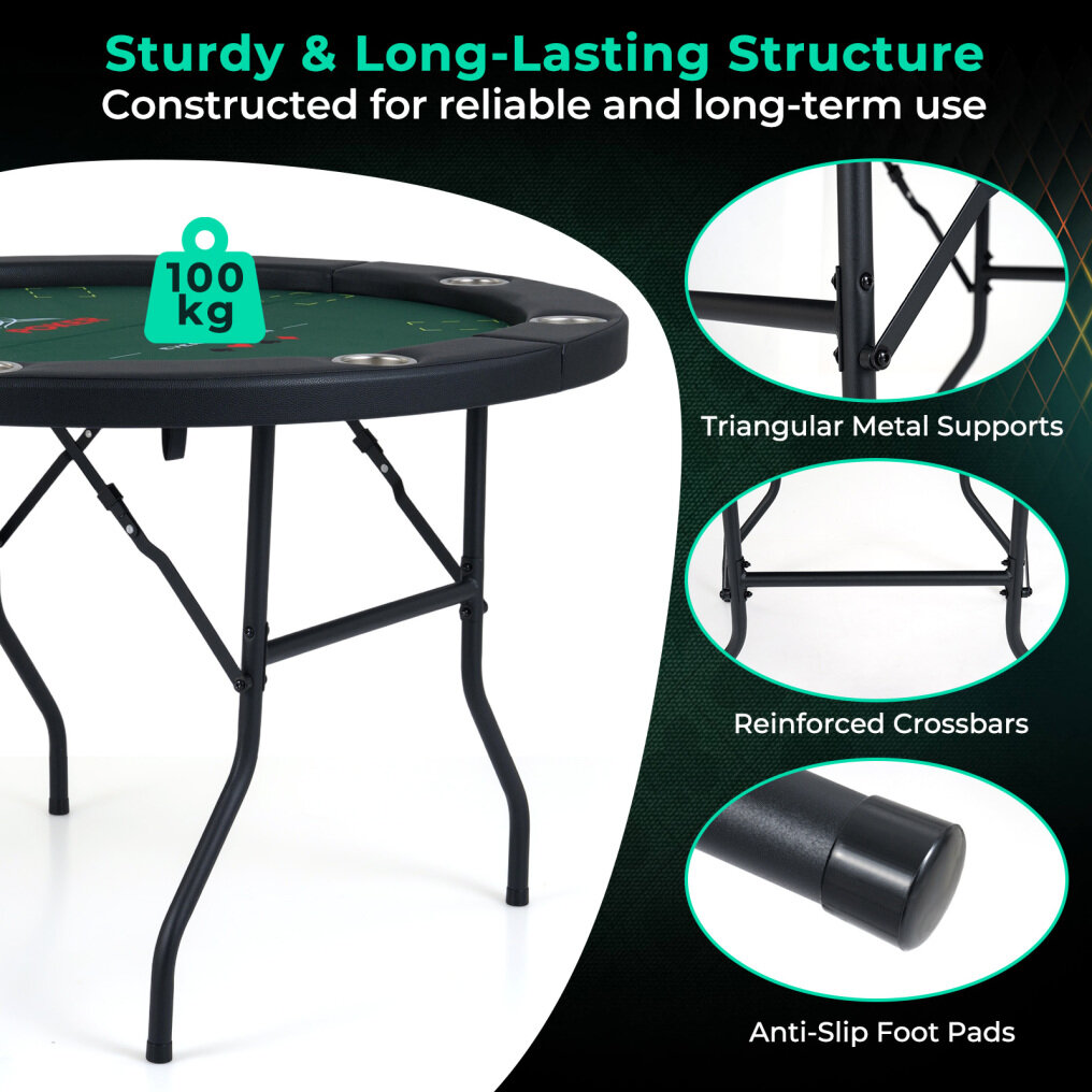 ● Sturdy & Long-Lasting Structure: Built with robust metal legs that support up to 220 lbs, this 8-player poker table is constructed for reliable and long-term use. Also, the triangular support design, combined with anti-slip foot pads, enhances stability to keep the table secure during intense games.
