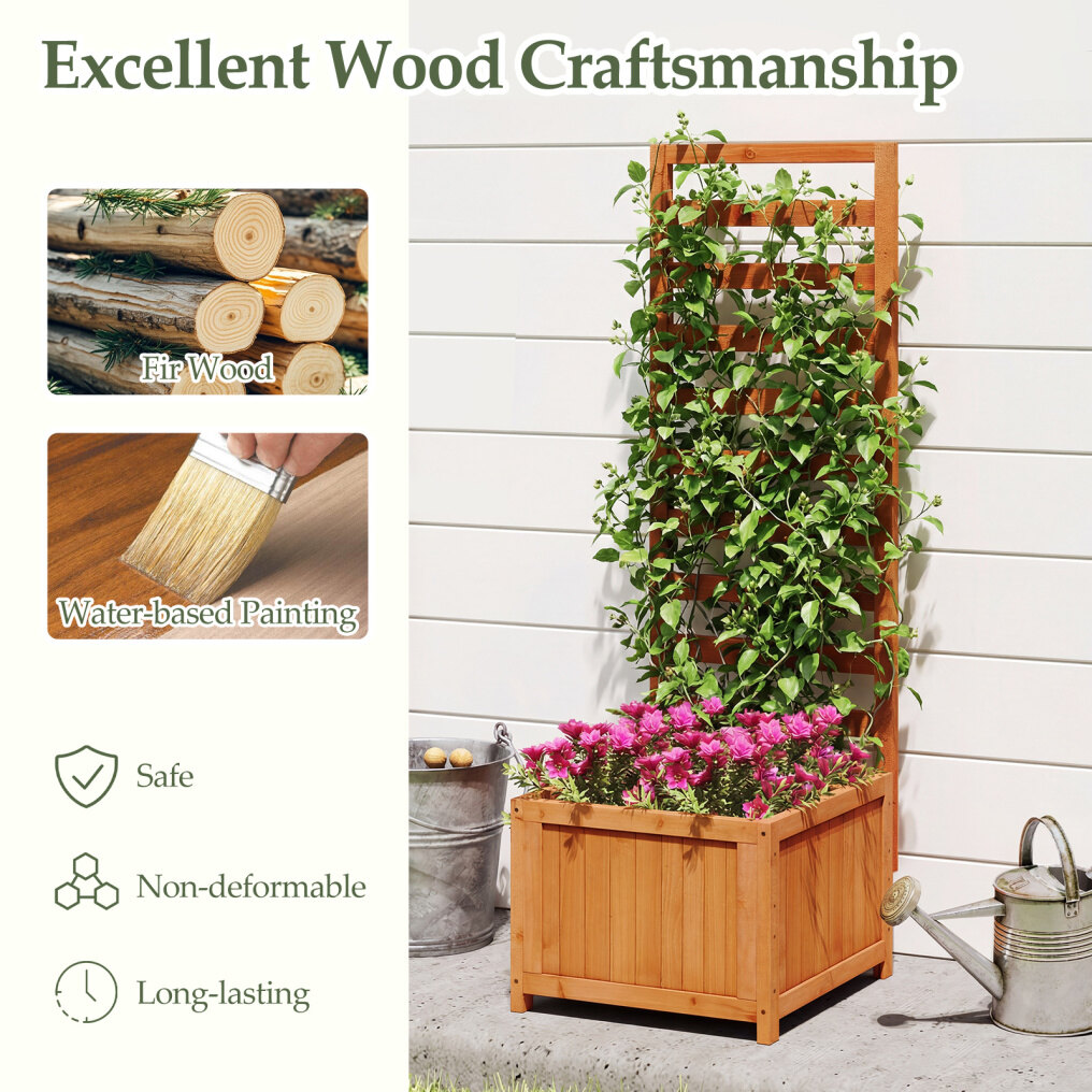 Functional 2-in-1 design: The combination of planter box and integrated trellis makes this wooden raised bed perfect for growing various plants, including vegetables, flowers, and fruits. The trellis also provides an ideal area for climbing plants or decorative accents.